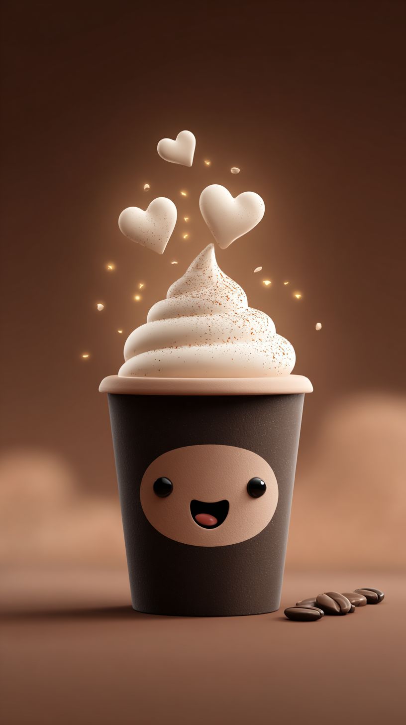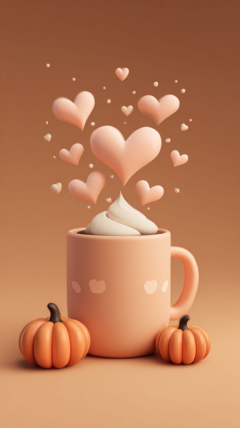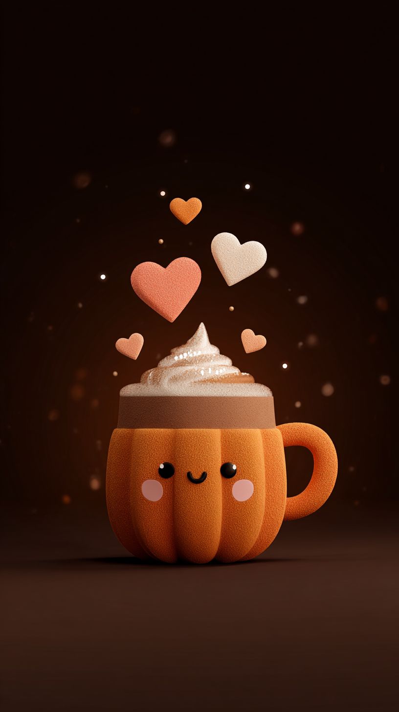 adorable 3d cartoon cup of pumpkin spice latte with steam shaped like hearts, kawaii vector cartoon style, warm autumn palette, minimal centered design, dark AMOLED background, high quality wallpaper --ar 9:16
