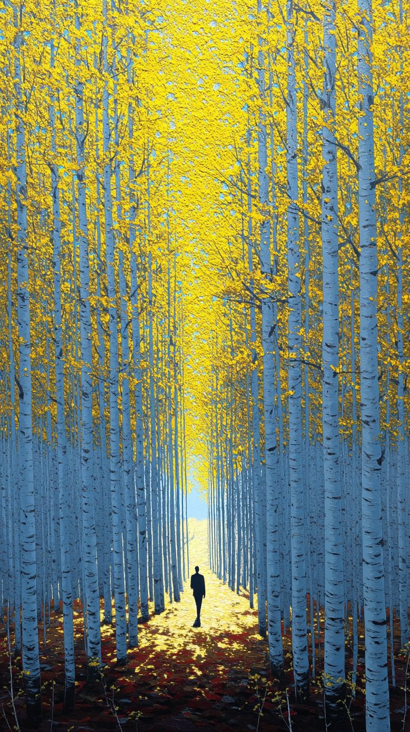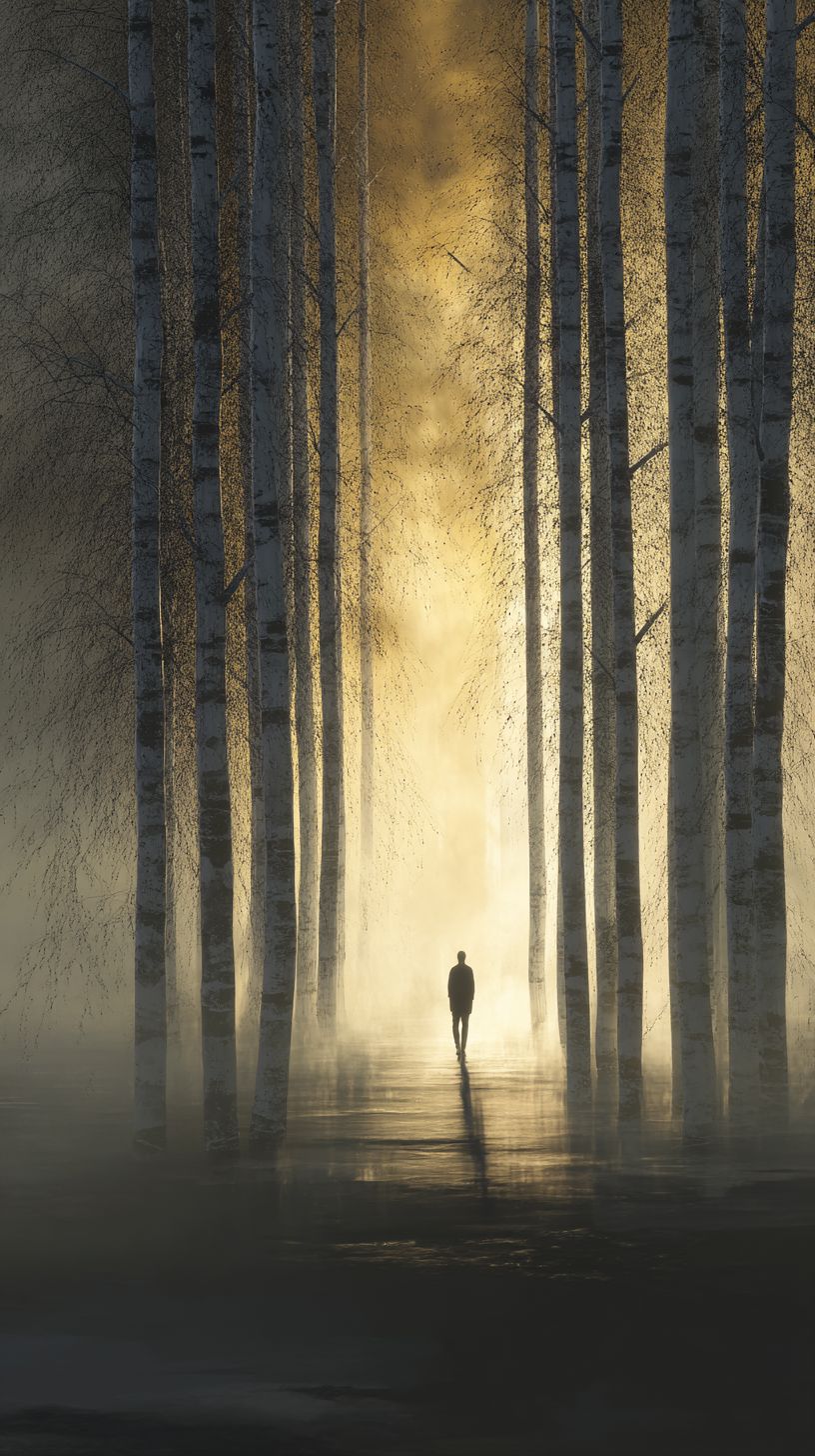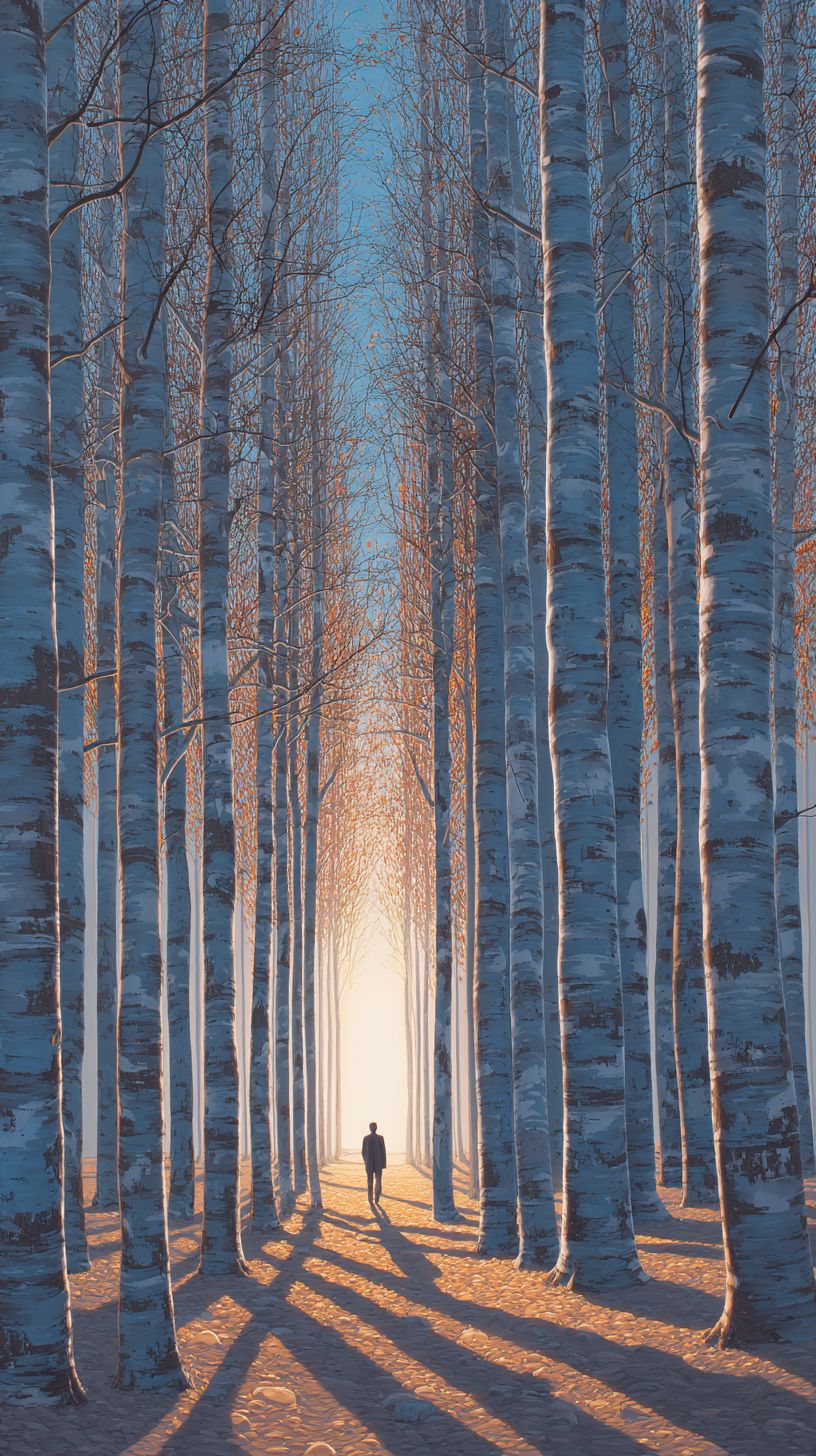minimalist birch forest path at golden hour, a single figure moving toward a radiant clearing, long shadows, fine detail bark texture, soft bloom highlights, clean composition, photorealism, poetic and contemplative, strong artistic presence, cinematic tonality --no text, watermark, logo, clutter --ar 9:16 --quality 2 --raw --stylize 95