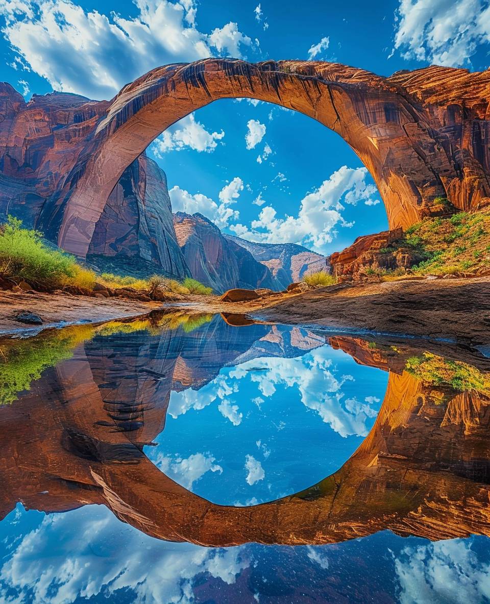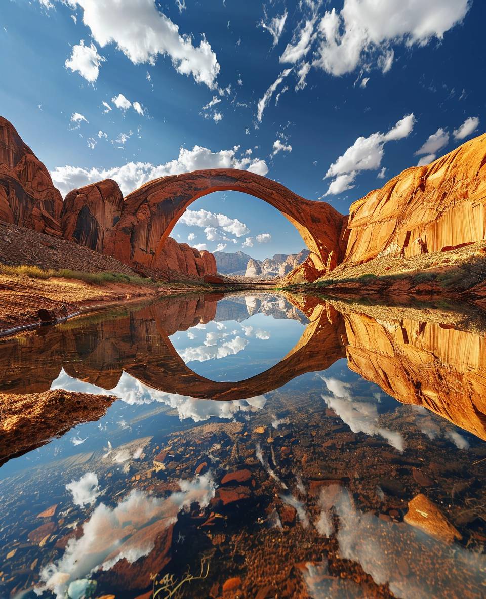 A stunning arch reflection in the crystal clear waters of rainbow bridge at arabian desert, utah --ar 13:16 --v 6.0