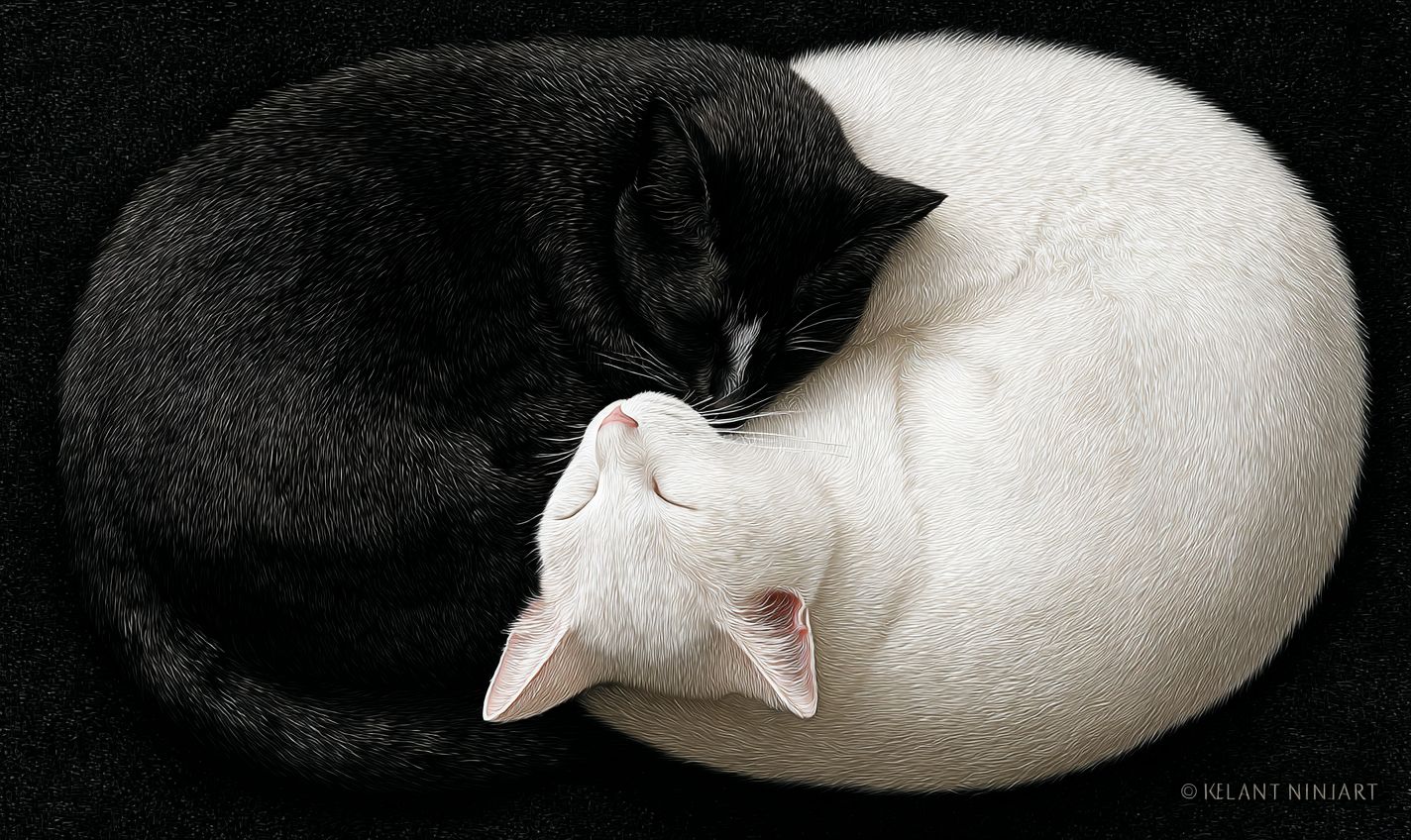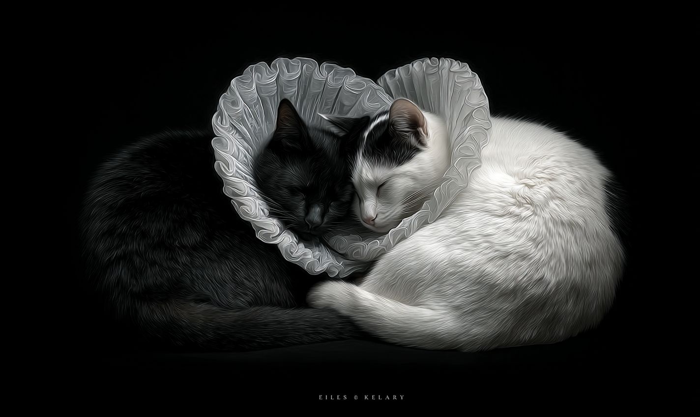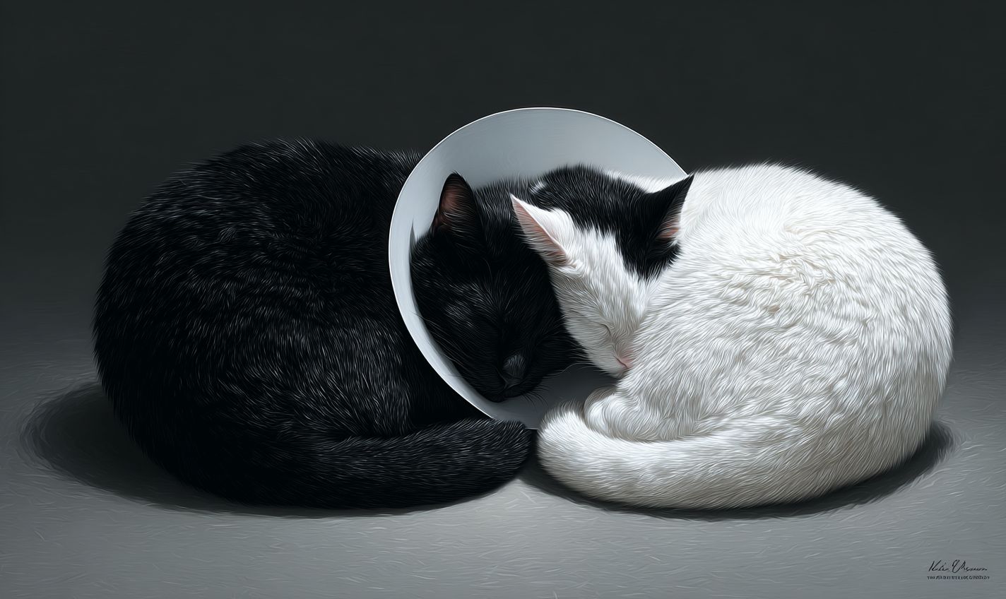 兩隻貓咪穿著伊麗莎白項圈,蜷縮成「陰陽」形狀,上面是黑色,下面是白色,它們只有一條尾巴。這是一幅高分辨率的照片寫實作品,具有專業的色彩分級,柔和的陰影,低對比度,以及乾淨銳利的焦點。