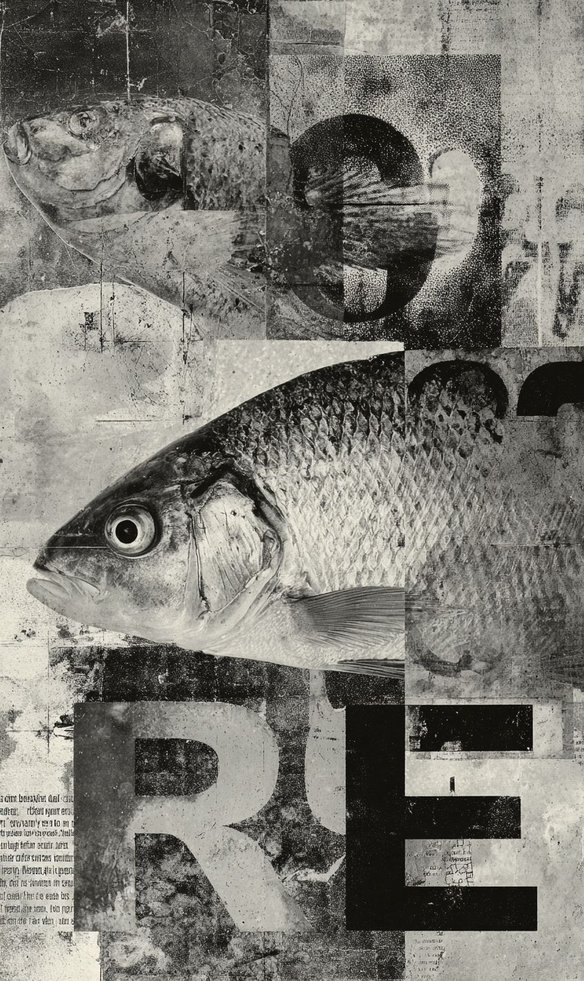 Vintage black and white collage art, abstract composition with fish and typography, grainy texture, mixed media style, letters R and E, nostalgic aesthetic --ar 3:5 --v 7.0