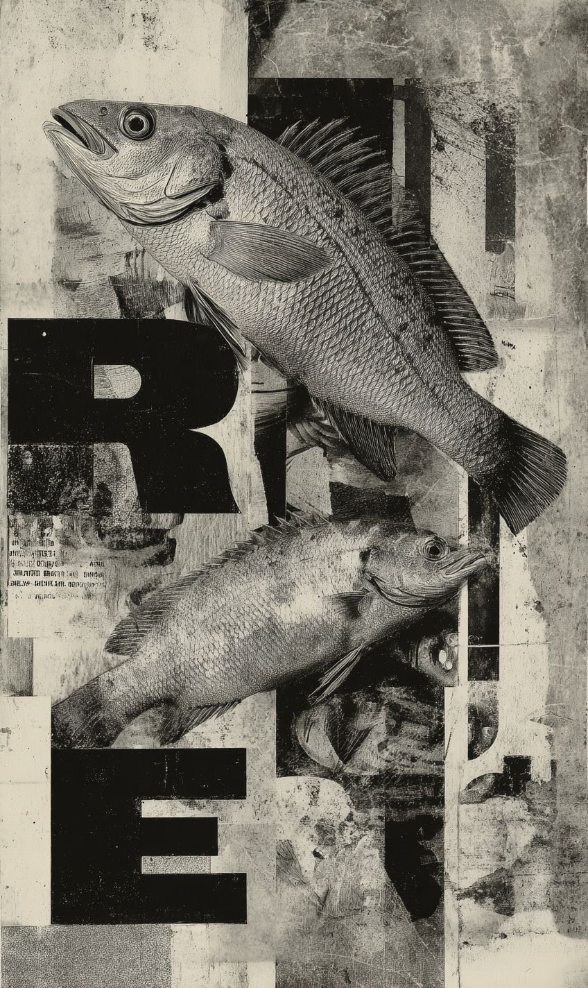 復古黑白拼貼藝術,魚和排版的抽象構圖,顆粒紋理,混合媒體風格,字母R和E,懷舊美學