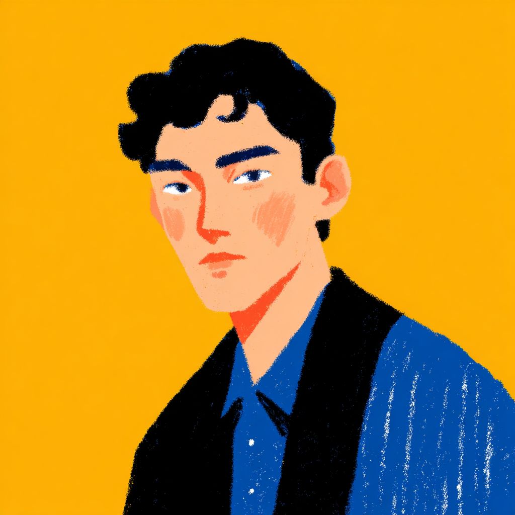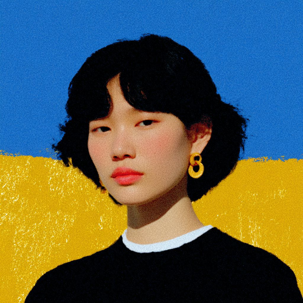 30多歲的韓國男性,無表情,柔和的印象,濃密的眉毛,黑色頭髮,棕色眼睛,劈頭卷髮,背景為金色,穿著時尚。
