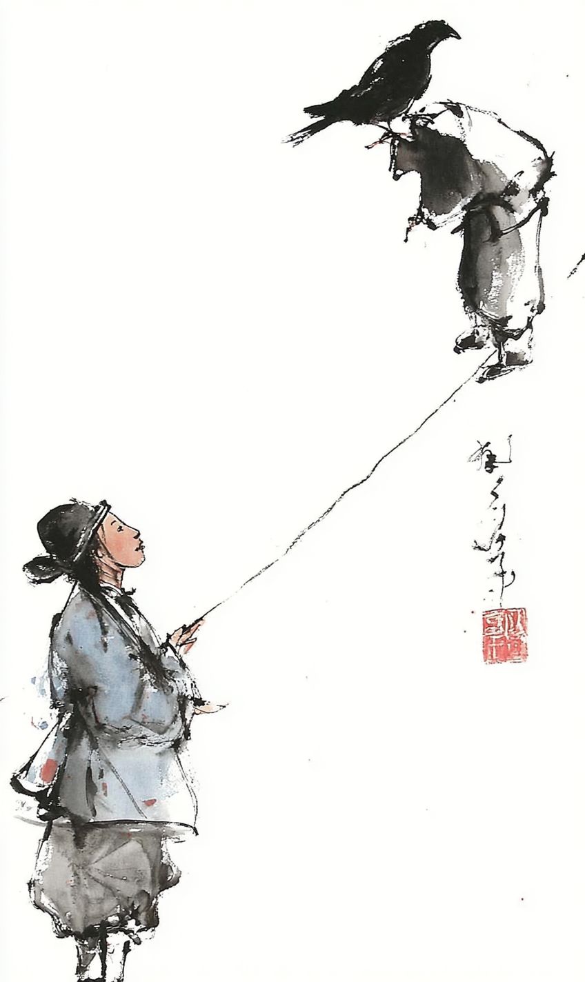 微笑的武士飲著杜松子酒,講述故事的構圖,12世紀大和繪風格。