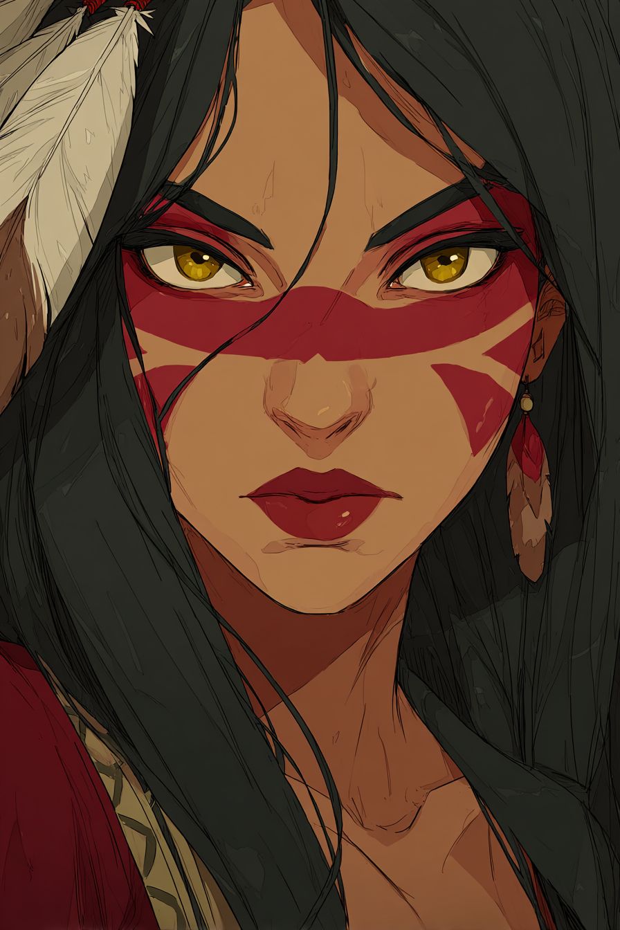漫畫風格的人物插圖,描繪了一位美麗的女性,長長的黑髮中帶有細微的白色條紋,生動的黃色眼睛,以及獨特的紅色部落風格面部紋身。她具備土著特色,佩戴着一根羽毛髮飾,皮膚呈溫暖的土紅色調。