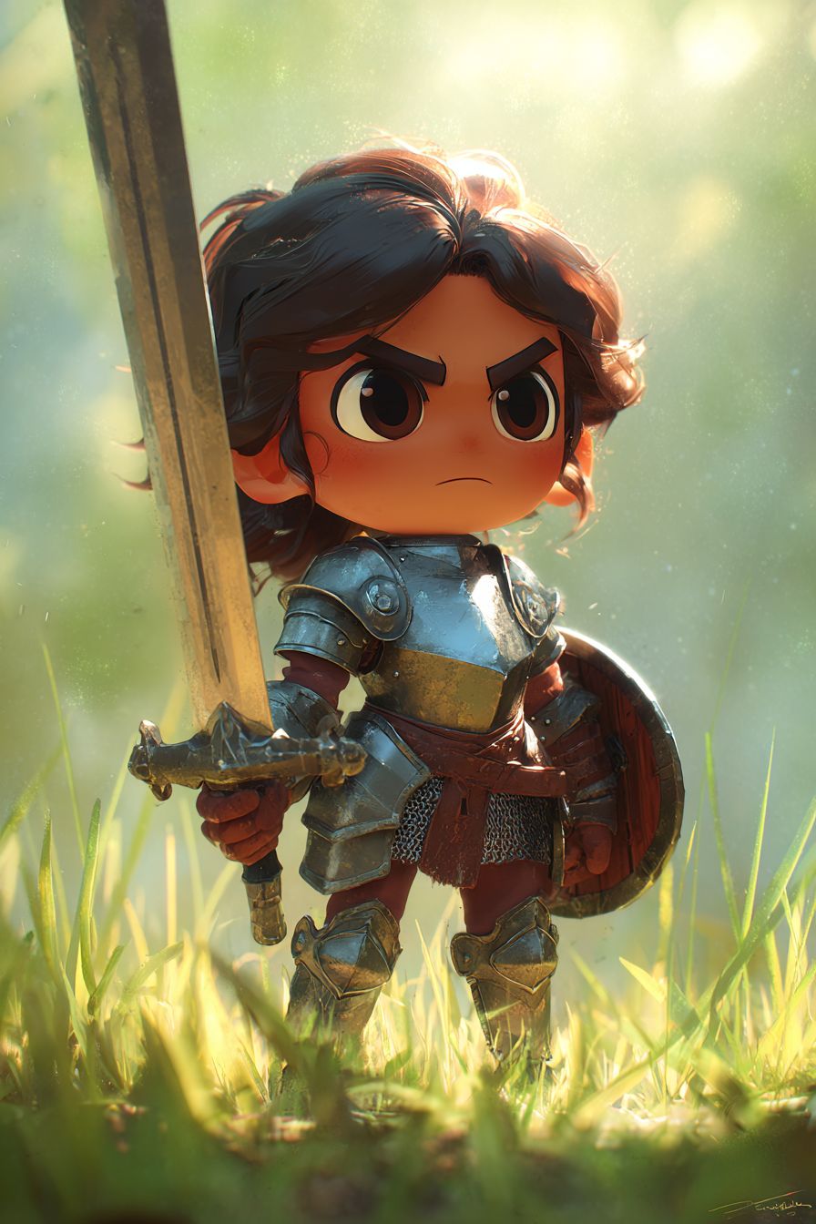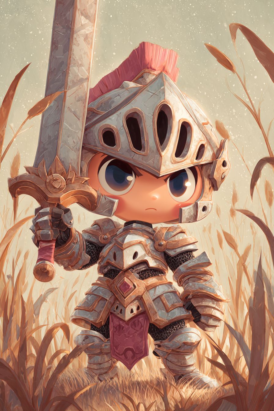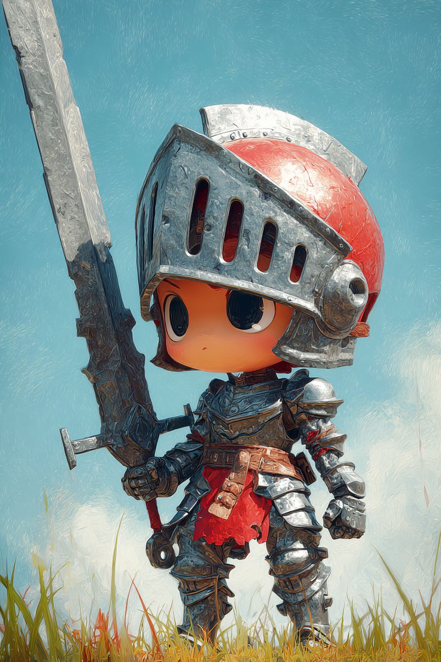 A chibi style knight with oversized shiny armor and a huge sword, looking determined but cute, standing in a cartoonish grassy field, large expressive eyes, simplified design, bright and playful color --ar 2:3 --v 7.0