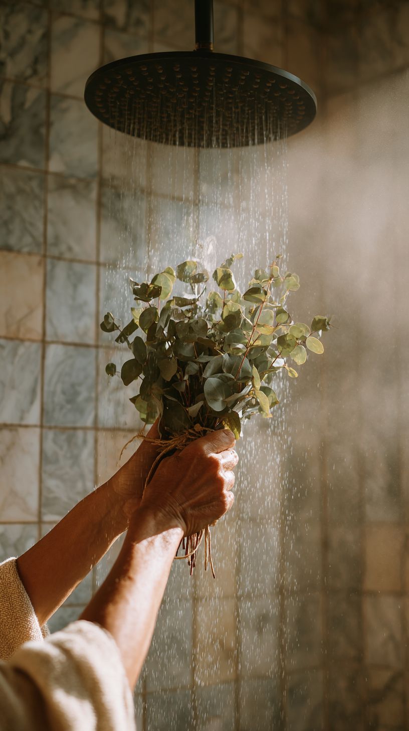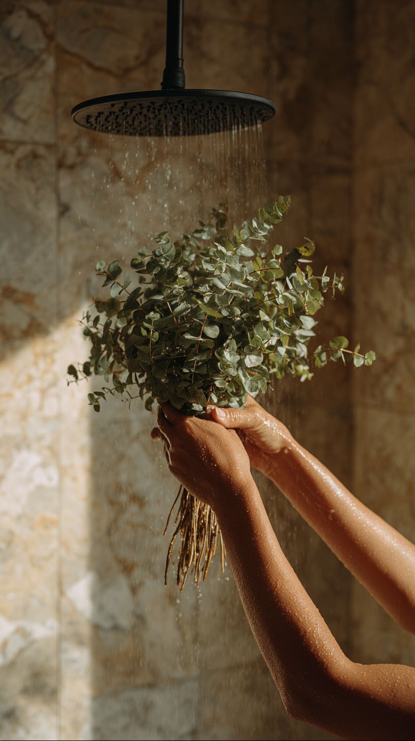 a cinematic, natural luxury photo of a woman’s two hands hanging a lush bunch of eucalyptus upside down from a large, round matte black rainfall shower head the eucalyptus stems are tied together with natural twine, leaves appear fresh, silvery-green, and slightly dewy focus on the hands with soft freckles, visible pores, and white-to-clear manicured nails warm morning light filters through softly, illuminating marble tiles with delicate beige-gray veining and creating gentle reflections on the black metal shallow depth of field with creamy bokeh, capturing tactile realism and subtle steam in the air muted, harmonious palette of greens, warm neutrals, and matte black editorial photography style inspired by Aesop campaigns, refined and sensory, calm atmosphere, minimalist composition, cinematic film tone with soft contrast and gentle warmth evokes ritual, purity, and organic sophistication in a modern luxury bathroom --ar 9:16 --profile 5eg4vg1