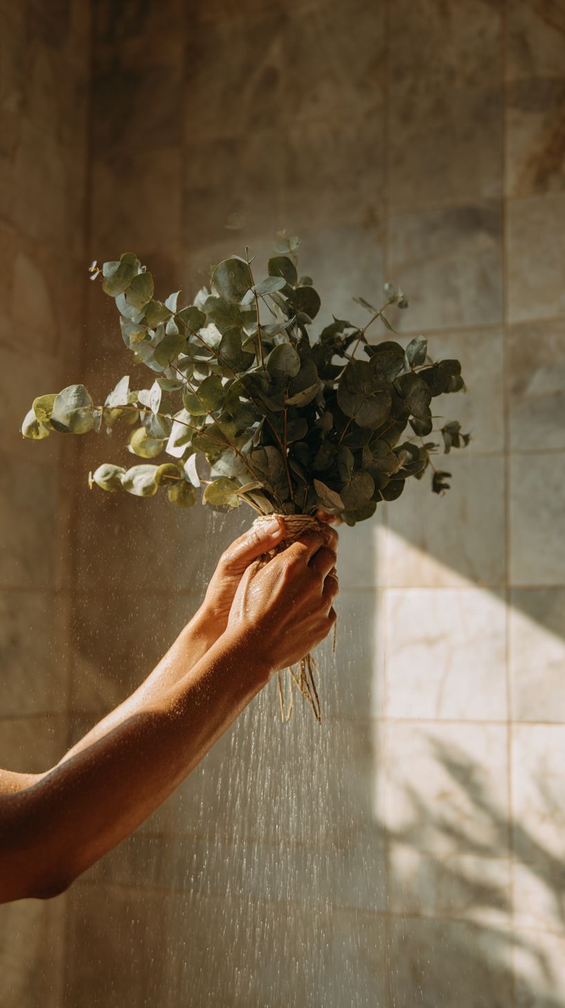 一位女性的雙手懸掛著一束新鮮的桉樹葉,營造出簡約而自然的奢華感