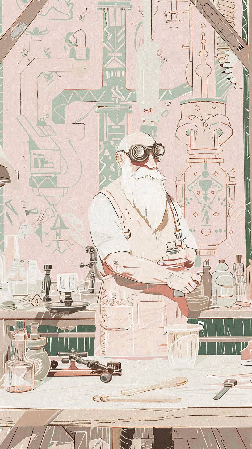 維多利亞時代的蒸汽龐克發明家在雜亂的工作坊裡,身穿護目鏡和皮革圍裙,四周環繞著複雜的機械和小工具。