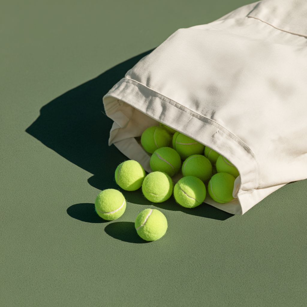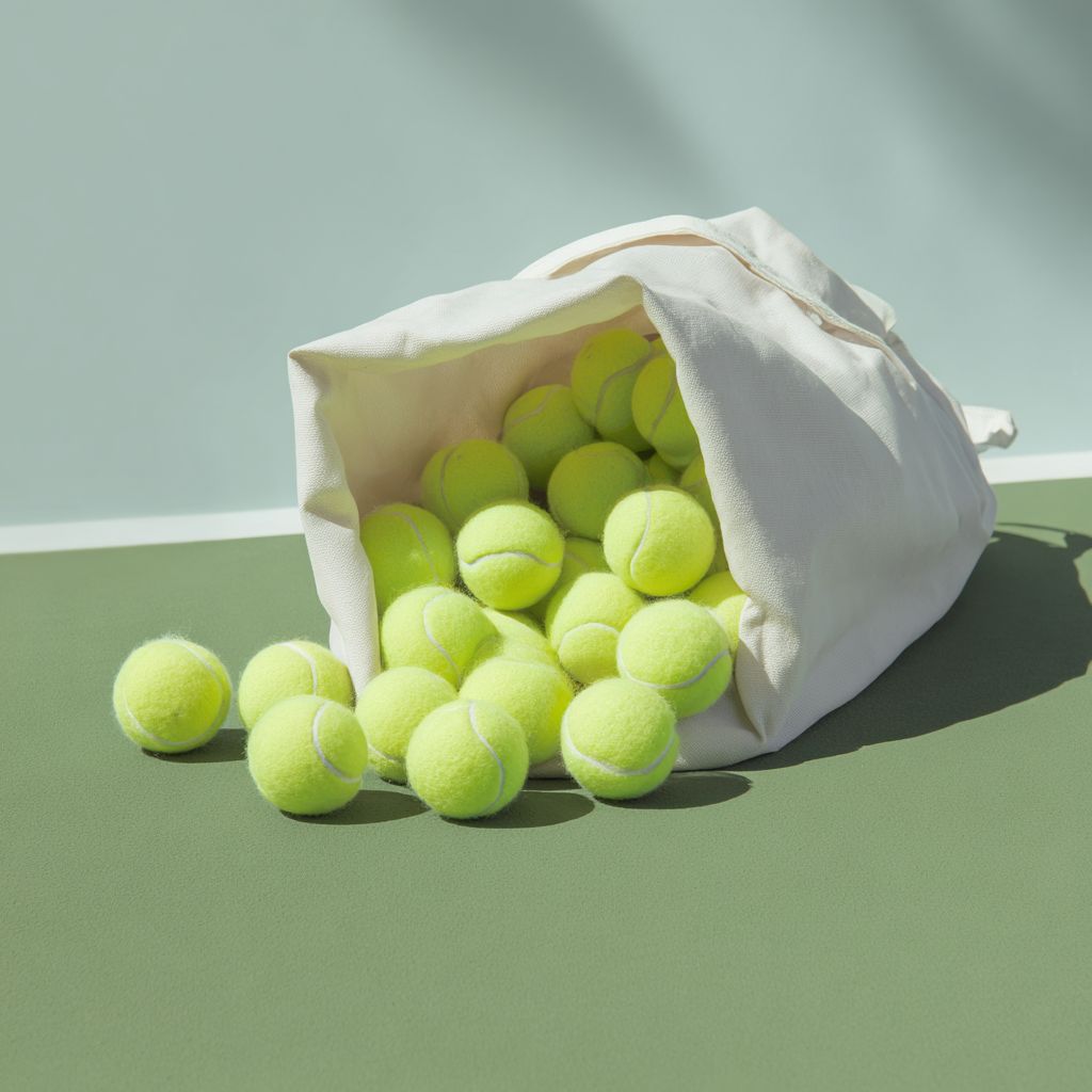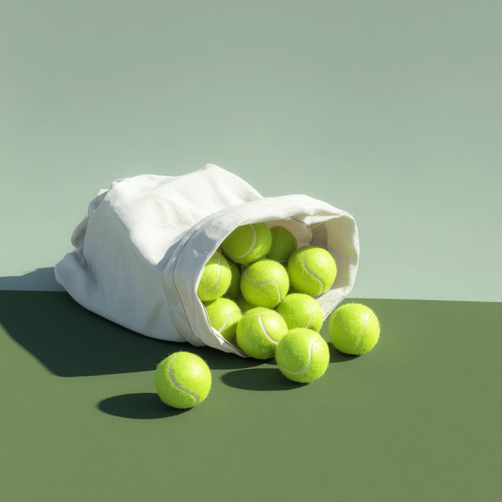a photograph of pickleball balls spilling out from an open white canvas bag on a green court, with a minimalist aesthetic, product photography style, soft shadows, high resolution, and a hyper-realistic appearance. --ar 1:1 --v 7.0