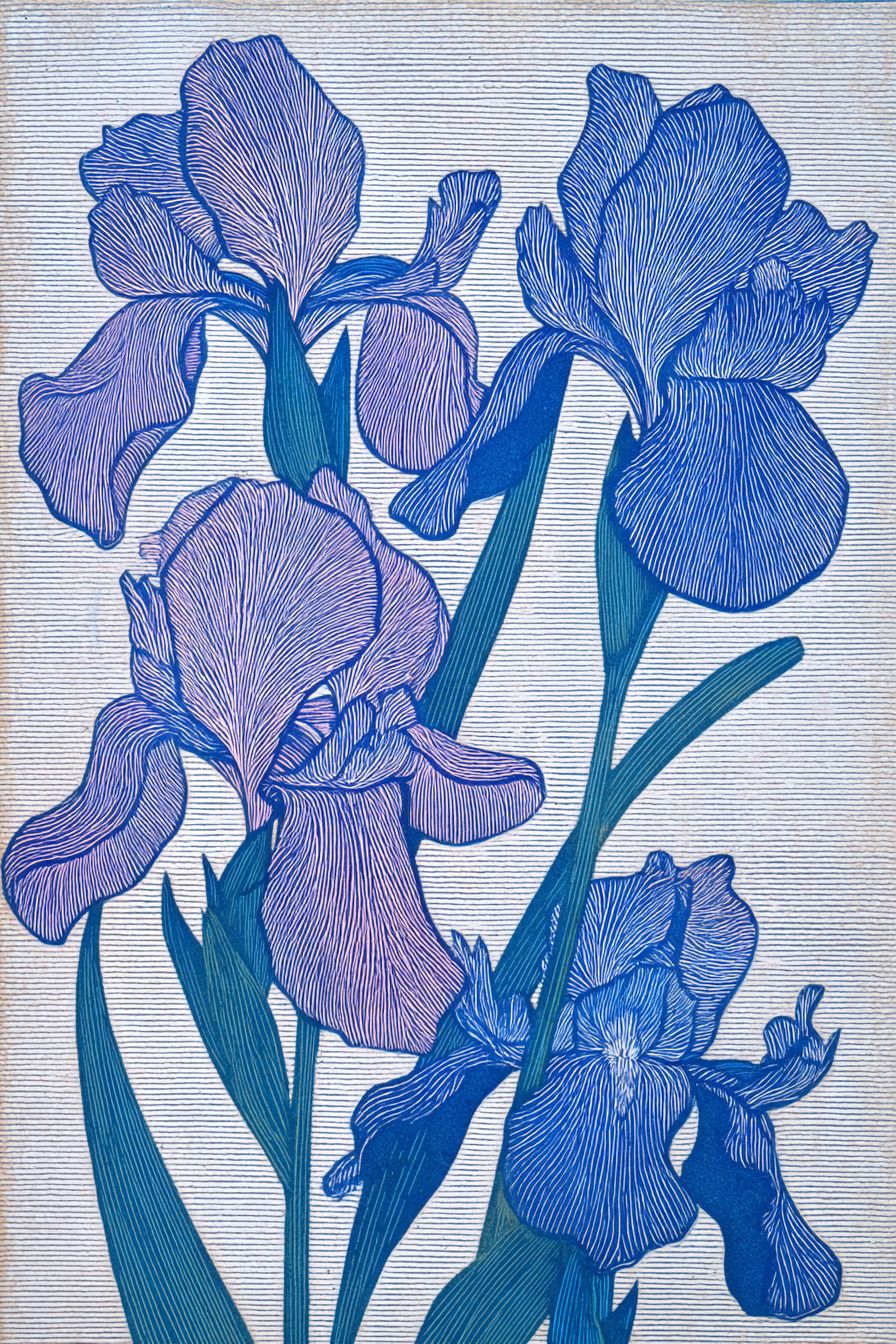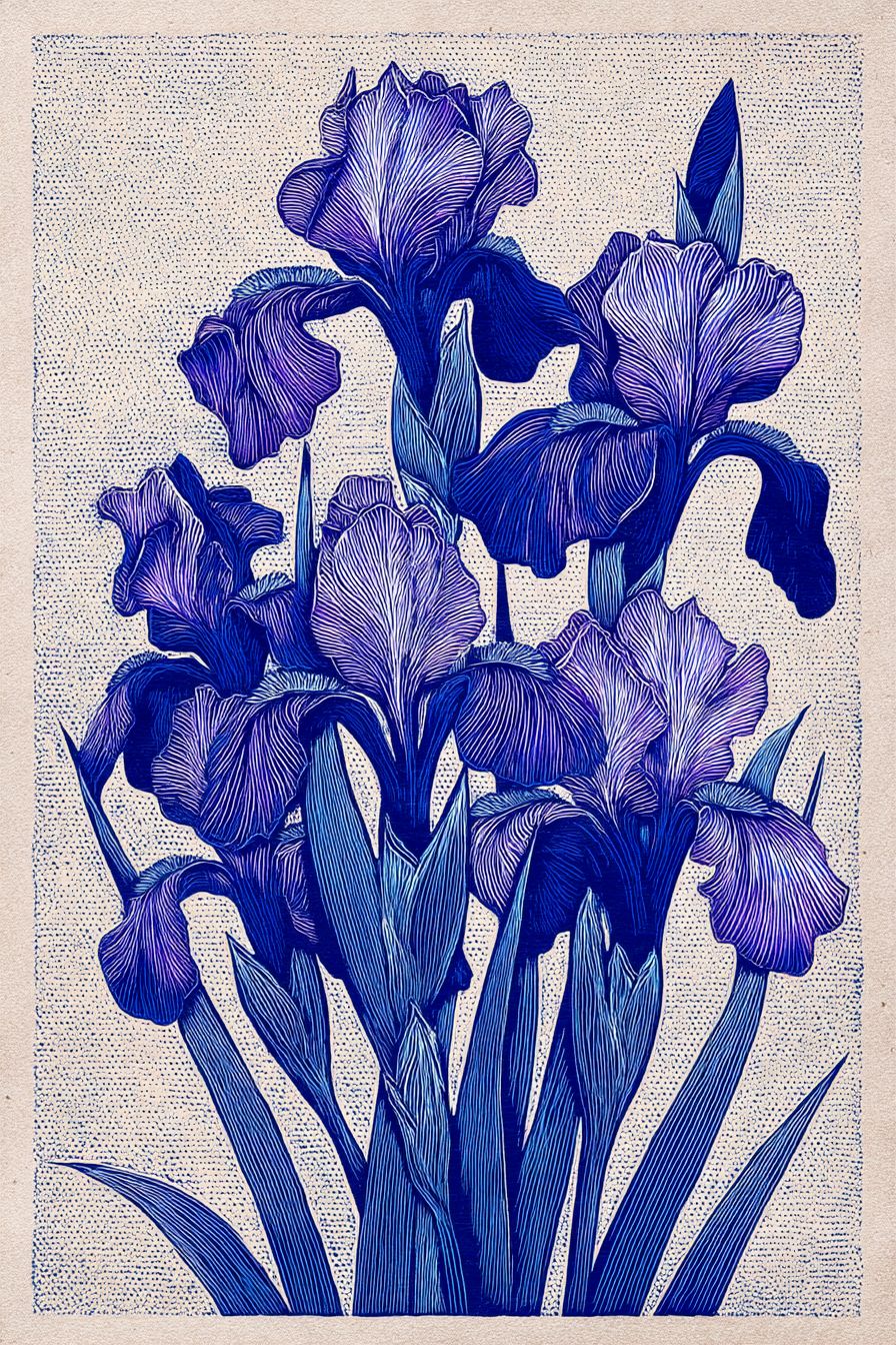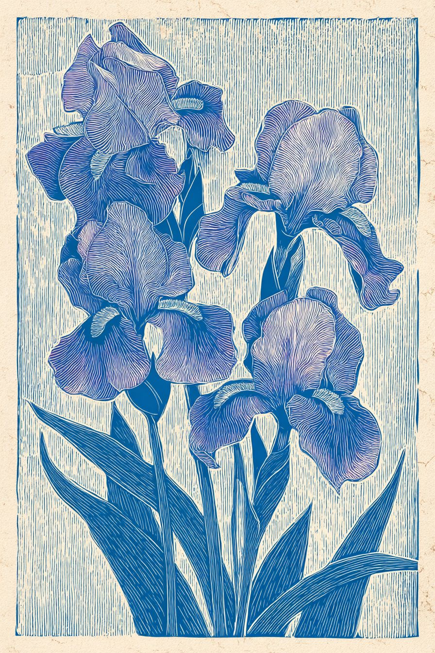一幅木刻風格的背景圖,展示了鸢尾花,藍紫色調,平面裝飾構圖,優雅寧靜