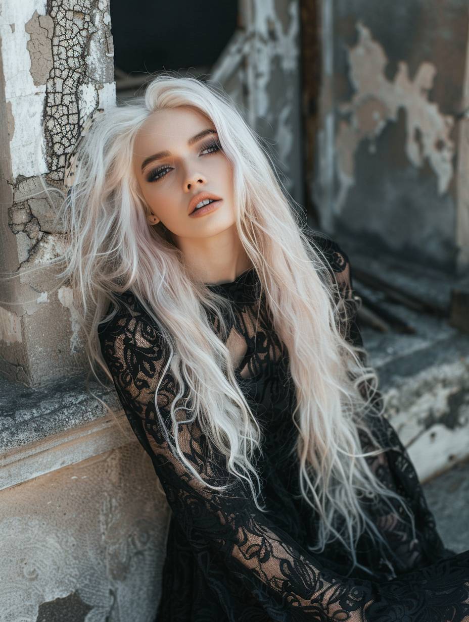 美麗的女性,長長的白粉色頭髮,穿著黑色蕾絲裙,背景是黑暗城堡的風格,專業攝影,高質量