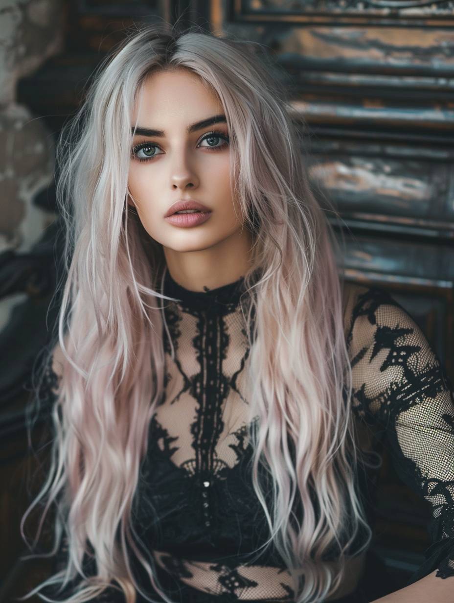 beautiful woman with long whitepink hair, black lace dress in the style of dark castle background, professional photography, high quality --ar 3:4 --v 6.0 --style raw