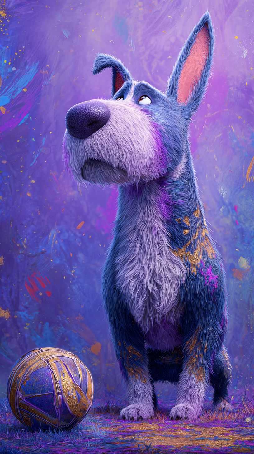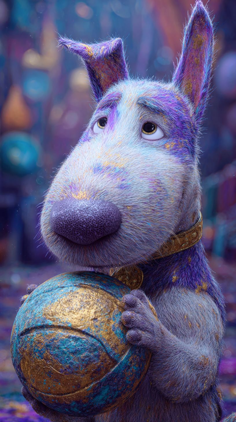 皮克斯電影風格的照片,展現了一隻極其可愛的奇幻鬥牛犬小狗,具有誇張的素描特徵,狡黠的表情,以及生動的紫色、藍色和金色點綴的柔和色調毛髮,正在玩一個大球,帶有些許黑暗幻想的色彩,就像在一個魔幻夢幻世界中進行冒險的瞬間。