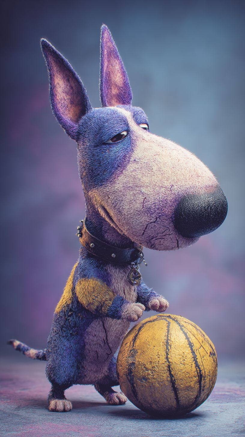 Pixar movie photo of an extremely cute whimsical Bullterrier-puppy with exaggerated, sketchy features, sly expression, and vibrant fur in pastel tones of purples, blues, and gold accents, playing with a big ball, with a touch of dark fantasy, as though caught mid-adventure in a magical, dreamlike world. --ar 9:16 --v 7.0