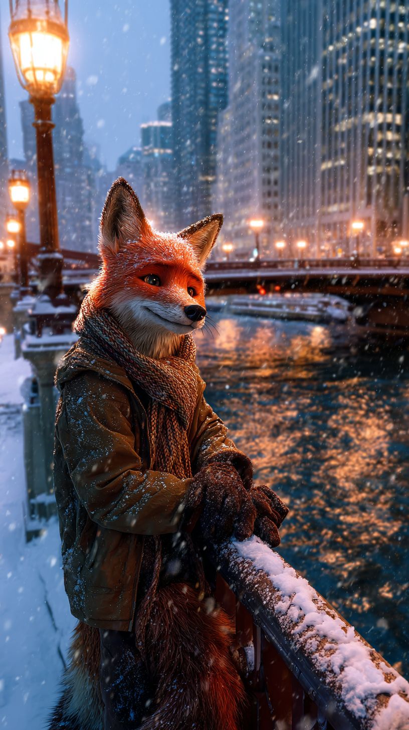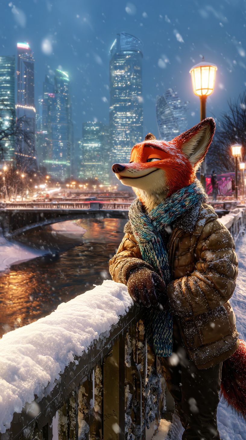 擬人化的狐狸(來自《瘋狂動物城》的尼克·王爾德)倚靠在冬季城市一座積雪覆蓋的橋欄上,穿著棕色蓬鬆羽絨服,厚厚的針織圍巾和手套;雪花飄落,毛髮和衣物上沾滿雪,背景是一條冰凍的河面,雪頂城市摩天大樓和溫暖的大街燈;涼爽的冬季氛圍,柔和冷色調的燈光;迪士尼動畫電影風格,高度詳細的毛髮紋理,電影般的構圖,8K,逼真的渲染。
