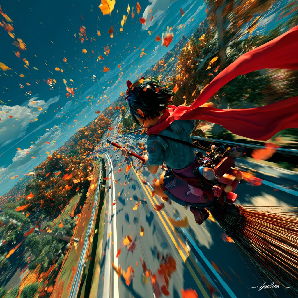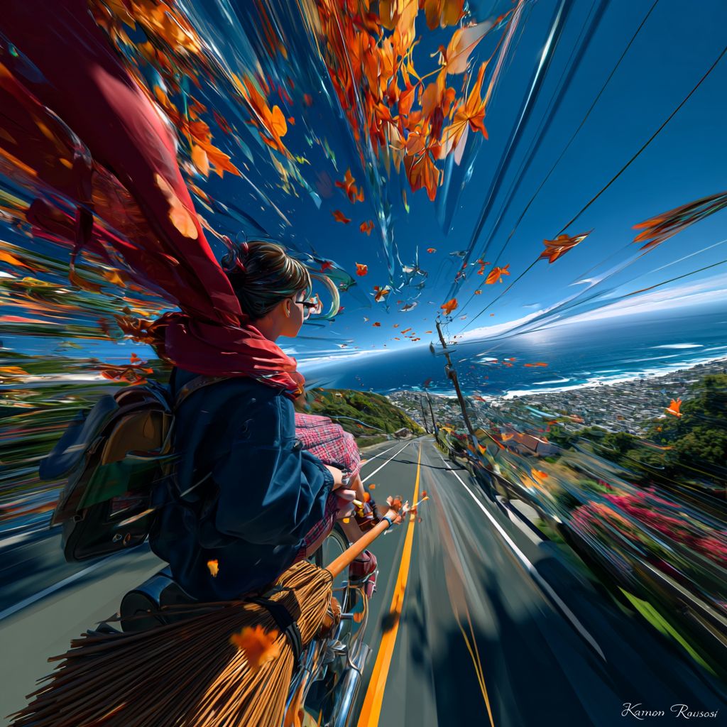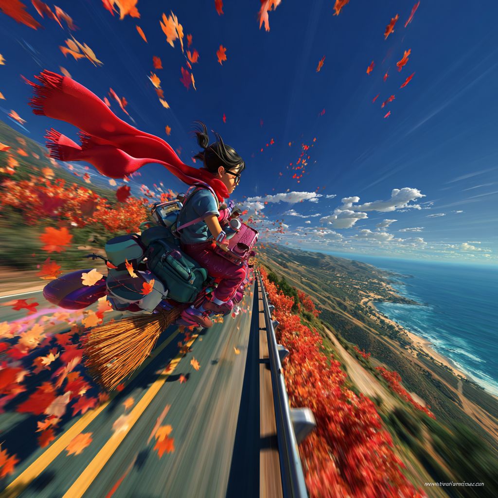 從第一人稱視角,以俯視的方式,構圖包含引導線、運動鏡頭、主題以及在動畫電影《琪琪快遞》中騎掃帚的女孩,捕捉到琪琪在加州的海岸公路上快速而全面的飛行,伴隨著運動模糊和速度線。頭頂是深藍色的天空,橙色的樹葉,紅色的圍巾在風中飄動,遠處的視線中隱約可以看到海浪。高分辨率,超現實的細節和廣角視角傳達冒險和自由的感覺。