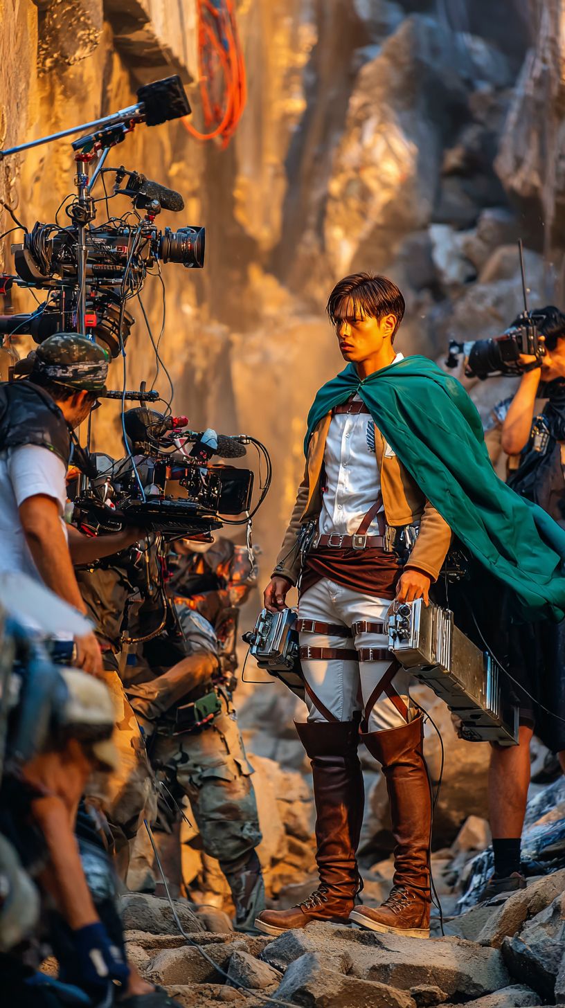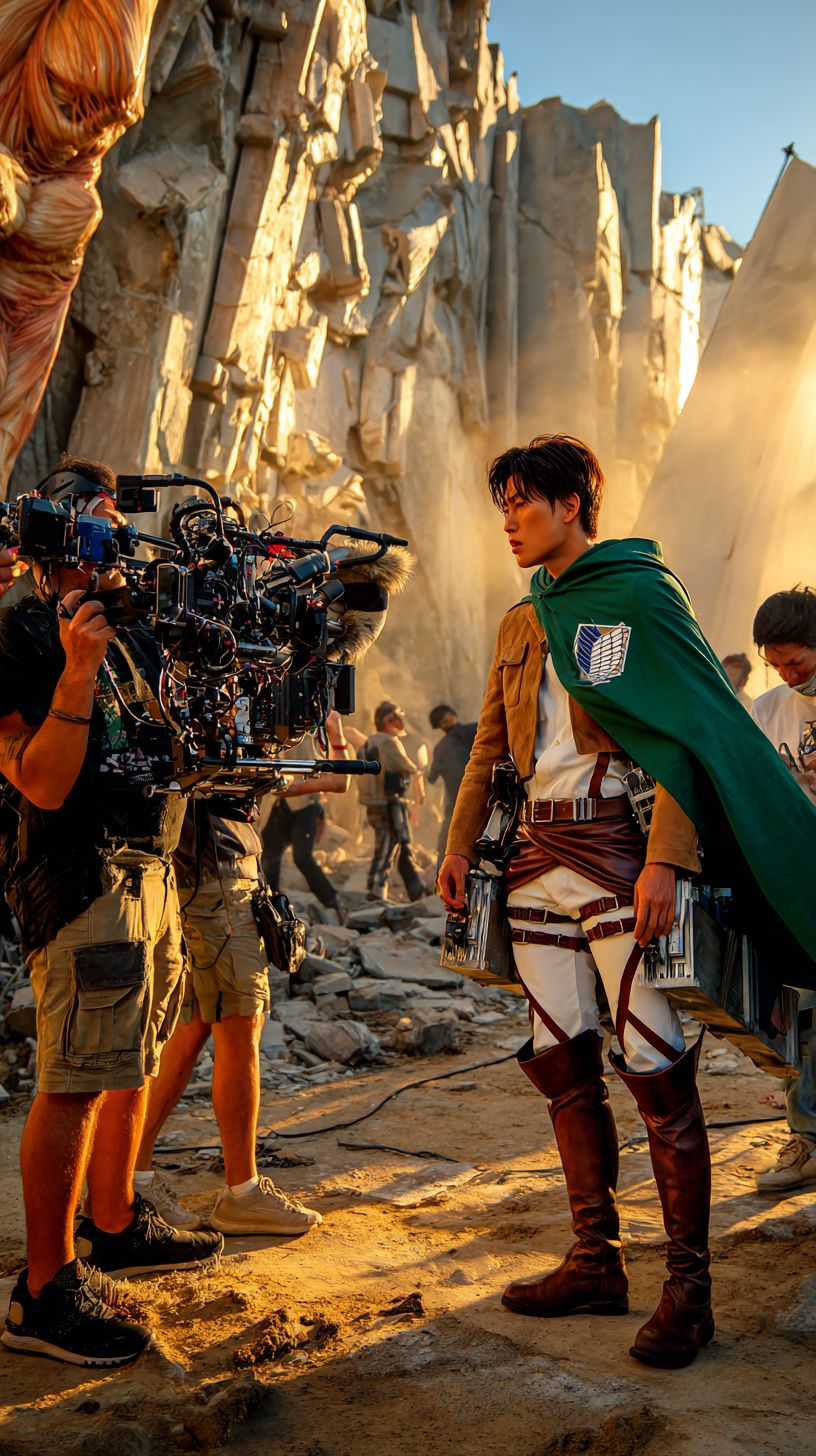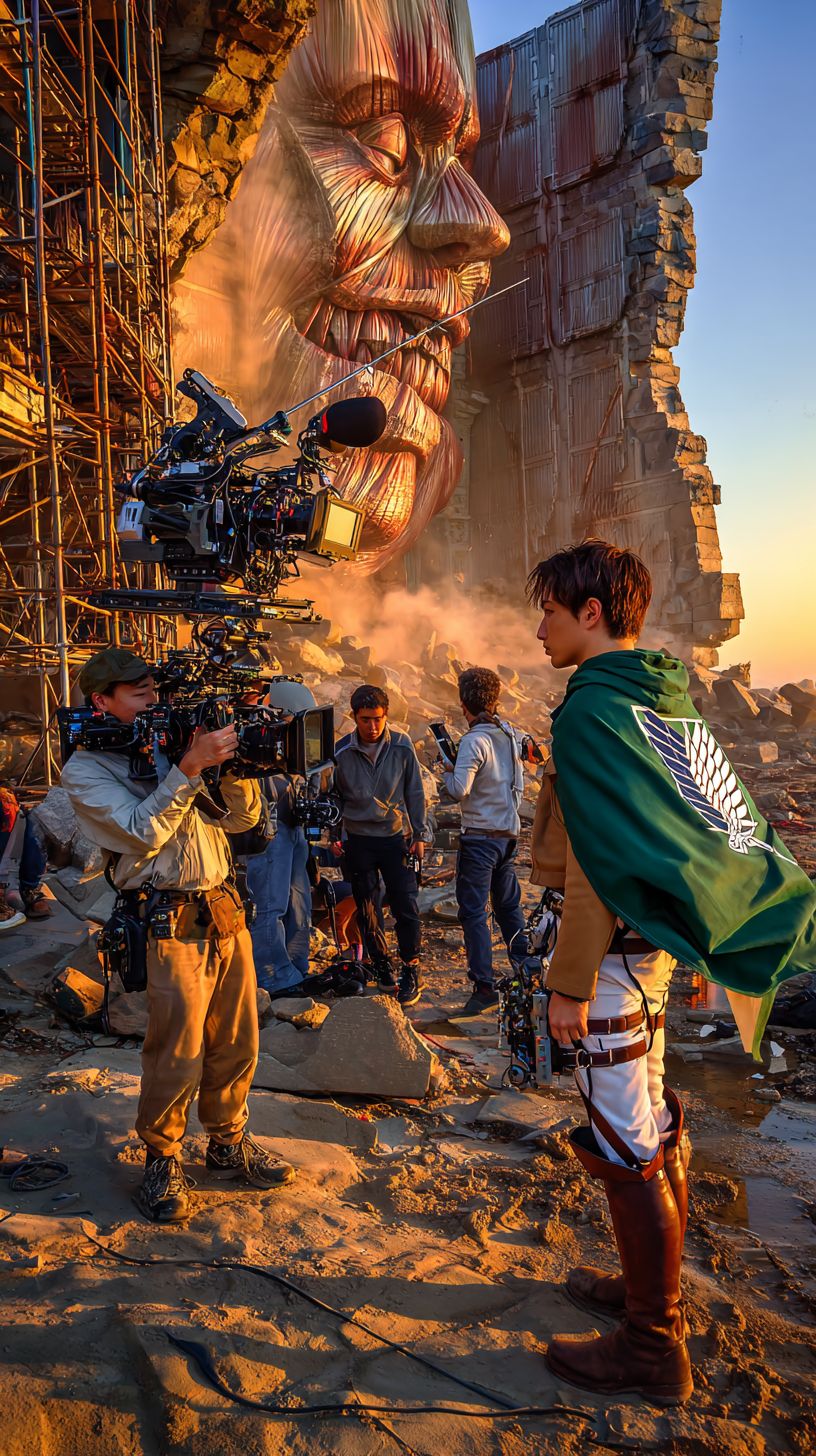 一部真人版《進擊的巨人》電影制作的幕後視頻場景。高耸的古老石牆因自然侵蝕而部分崩潰,倒下的碎石意外揭示出嵌在牆內的巨型巨人的上半張臉,只有其深邃的眼睛、鼻子和沒有嘴唇的可怕嘴巴可見。這張巨人的臉完全沒有皮膚,暴露出濕潤、拉伸的肌肉纖維和腱,特別是在嘴巴和下顎周圍,給它一種怪異、解剖學上的外觀。它在牆內靜止而無聲。一位身著偵查兵團全套制服的日本演員站在旁邊,驚呆了,穿著米色襯衫、棕色戰術背帶、白色褲子、高筒皮靴和3D機動裝備。帶著自由之翼標誌的綠色斗篷在風中飄動。拍攝現場,電影工作人員操作RED Komodo相機,使用穩定器,調整燈光設備和音響麥克風,導演在旁邊指揮。塵土和霧氣在金色的晨光中瀰漫。使用35mm廣角鏡頭拍攝,淺景深,以及脫飽和的電影色彩分級,營造出緊張和戲劇性的氛圍。