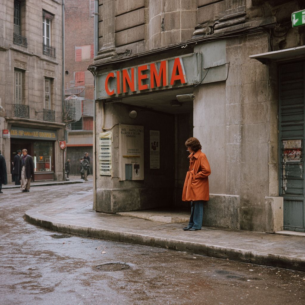 70年代,里昂,一家電影院的「CINÉMA」標誌,入口有一位穿著橙色70年代外套的法國女性,她靠在牆上抽煙,寒冷的中午,看起來像是那個時代的一張真實照片。