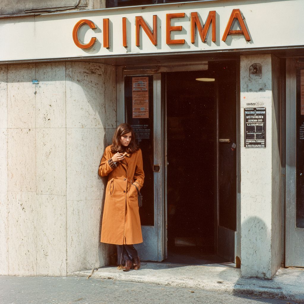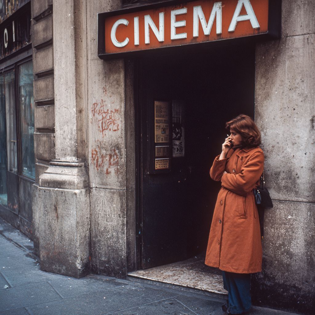 70s, lyon, a cinema with "CINÉMA" sign, on the entrance is a french woman with orange 70s coat taking a pull from a cigarette while leaned on wall, cold noon, it looks like a real photo from that time --profile k8s196u --v 7.0 --s 50