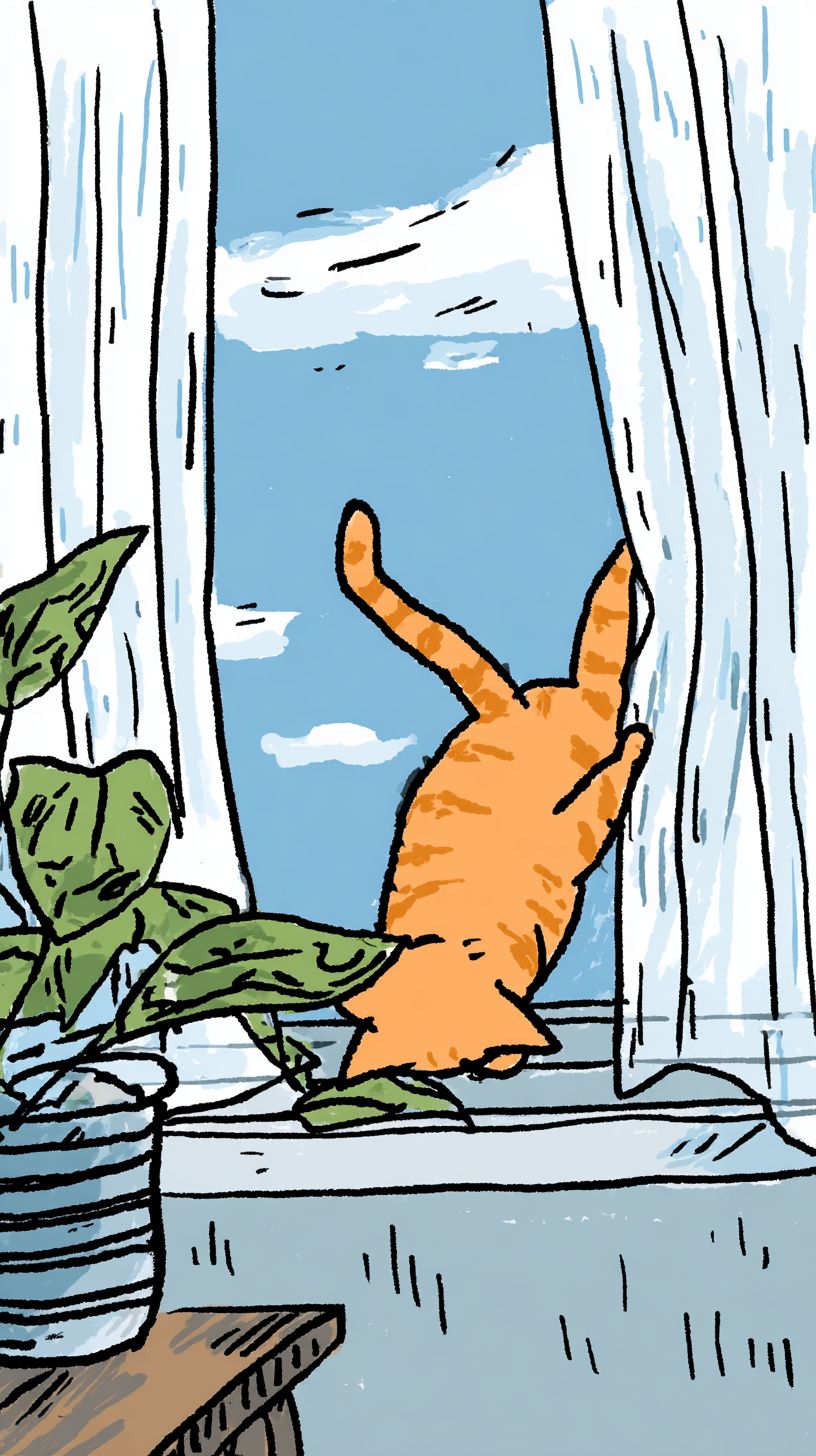 一個二維插圖,展示了午后的陽台窗戶,一隻橙色的貓拱起背部,拉扯著輕薄的窗簾,尾尖輕拂著波士頓常青藤的葉子。