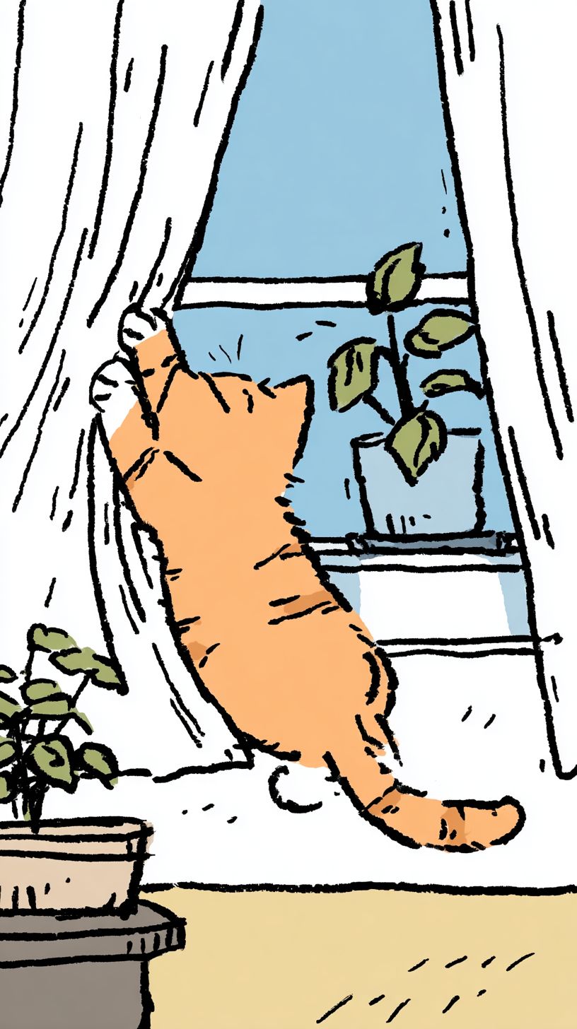 A 2D illustration of afternoon bay window, orange cat arching back pulling sheer curtain, tail tip brushing pothos leaf. --ar 9:16 --profile 7eum9q4 --stylize 50 --v 7.0