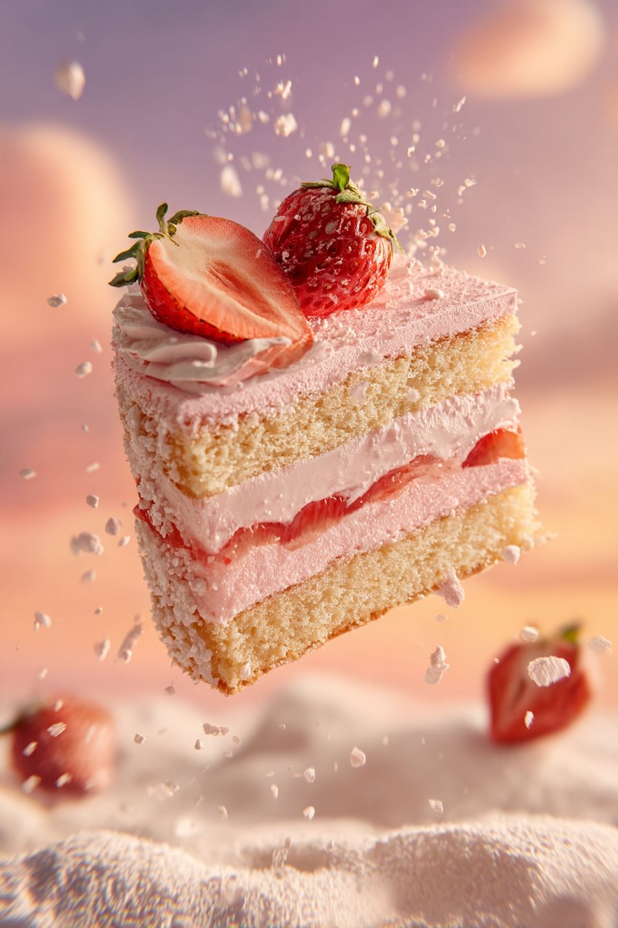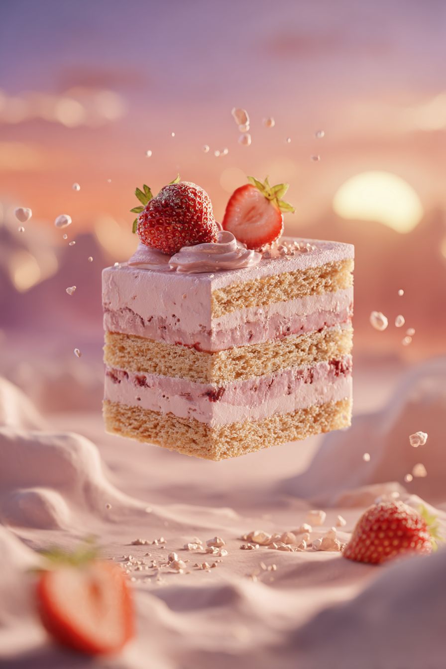 a classic German strawberry cream cake slice with a visible light sponge base, a rich strawberry compote layer and smooth soft pink cream, topped with fresh strawberries, presented as a refined luxury dessert. the slice floats gently above a soft, cloud-like surface, positioned heroically and slightly angled toward the camera, giving it an iconic, monumental presence. fine powdered sugar, delicate cake crumbs and subtle strawberry juice droplets are suspended in mid-air around the slice. the scene is set in a dreamy pastel atmosphere with warm sunset tones of blush pink, peach, apricot and soft lavender, creating a calm, almost ethereal mood. cinematic soft lighting with gentle highlights, shallow depth of field, creamy bokeh background, ultra-realistic textures, high-end luxury food editorial photography, 8K, elegant, poetic, breathtaking composition. --ar 2:3 --v 7.0