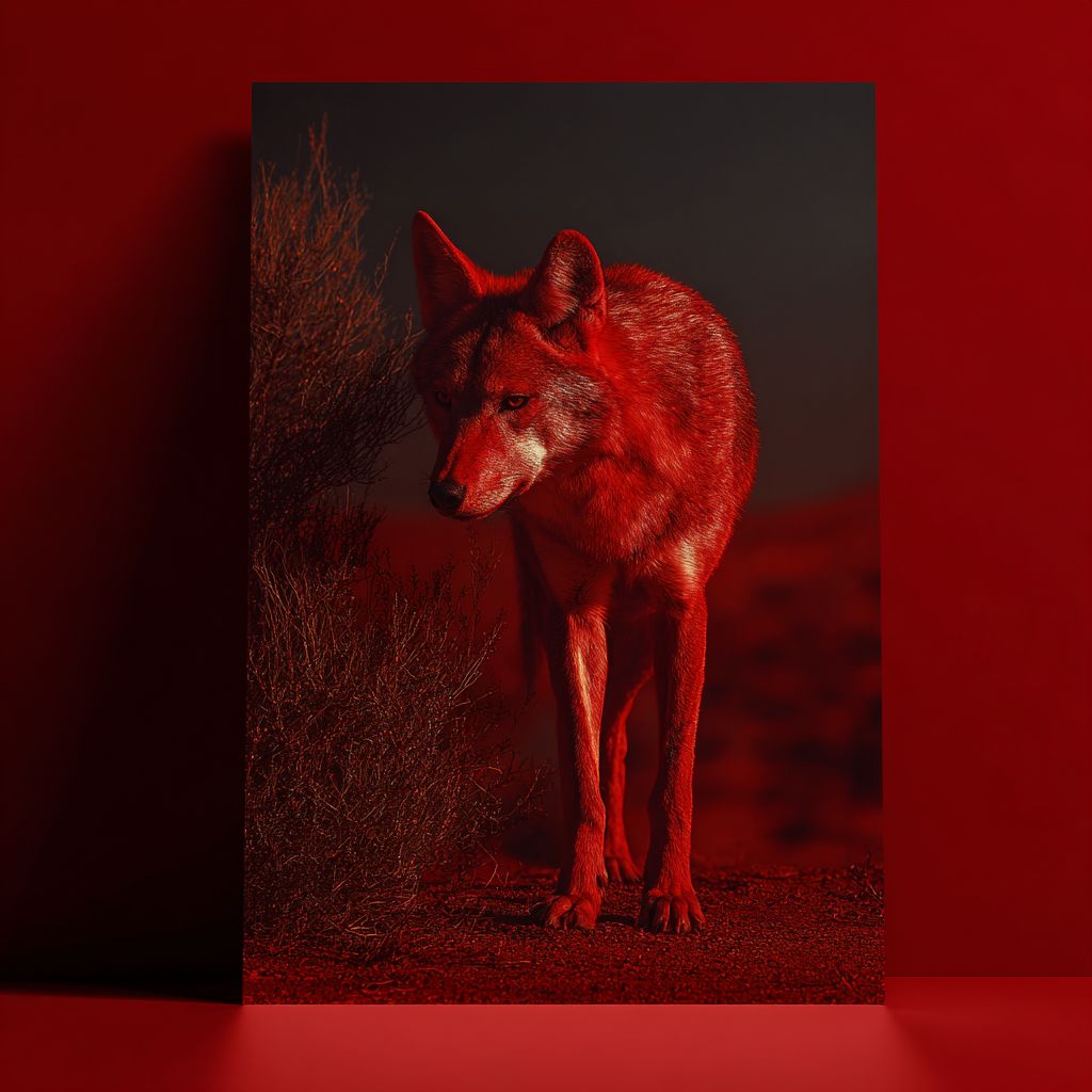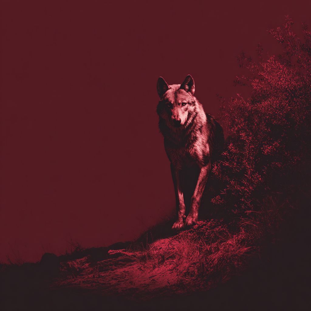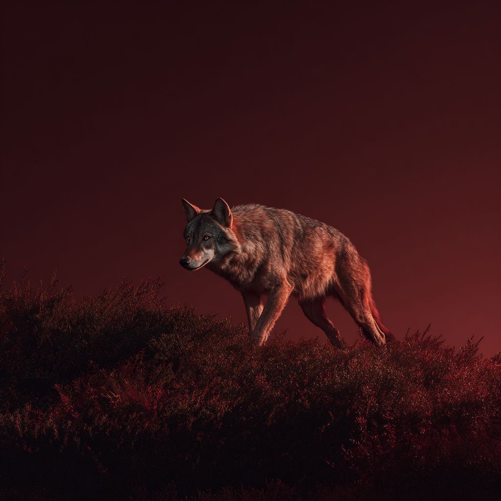 Create a promotional poster matching the provided image: a glossy Red Wolf on its four legs, coming around the corner behind a bush, centered against a deep gradient crimson-to-ink background, dramatic rim and specular highlights on the horse to emphasize muscle and sheen, subtle ground shadow beneath, minimalistic clean layout. Maintain high contrast, cinematic lighting, film grain texture, and elegant, luxury aesthetic. Aspect ratio 16:9 with the wolf on the right hand side of the image. Colors: deep crimson background, near-red wolf. Preserve composition and red wolf pose exactly. --v 7.0