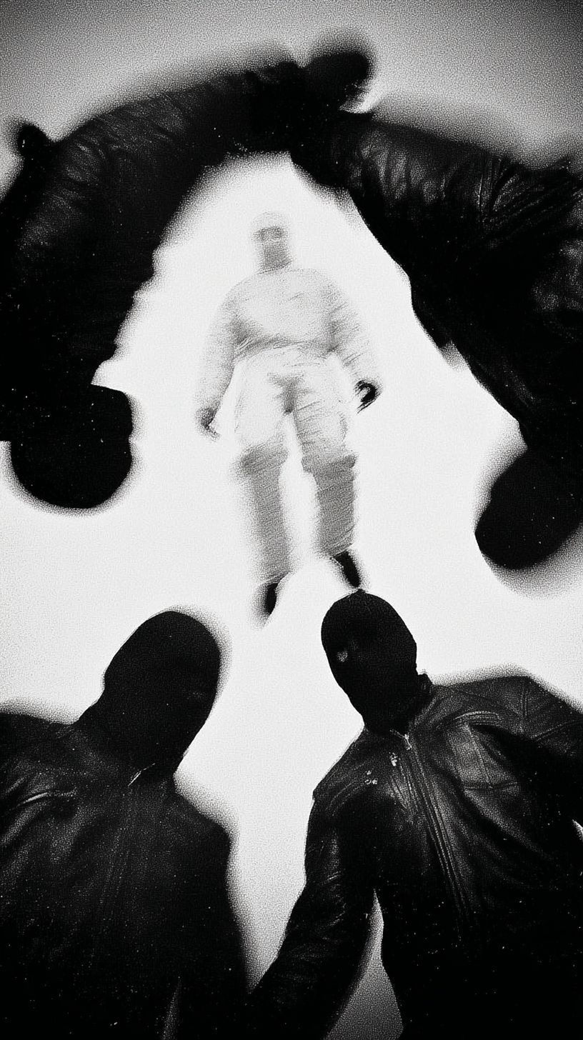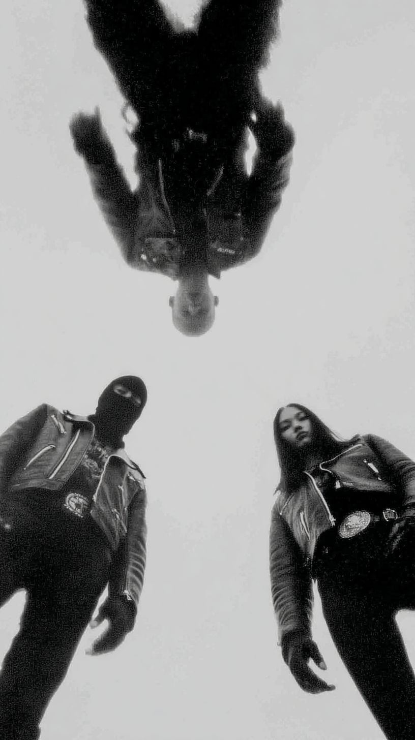 low-angle shot of three people wearing leather biker jackets , their feet pointed upwards towards the sky. looking down at them from above is an white man with his head covered by balaclava. they stand on top of each other, forming a circle. the background should be a plain white. --ar 9:16 --profile zopfwd8 --v 7.0