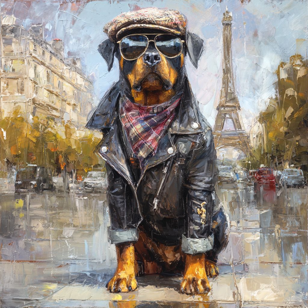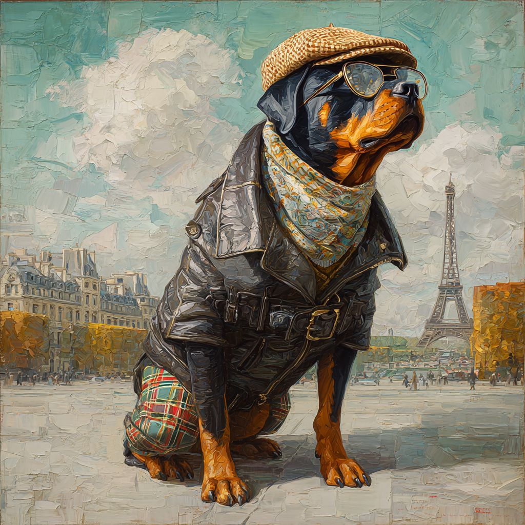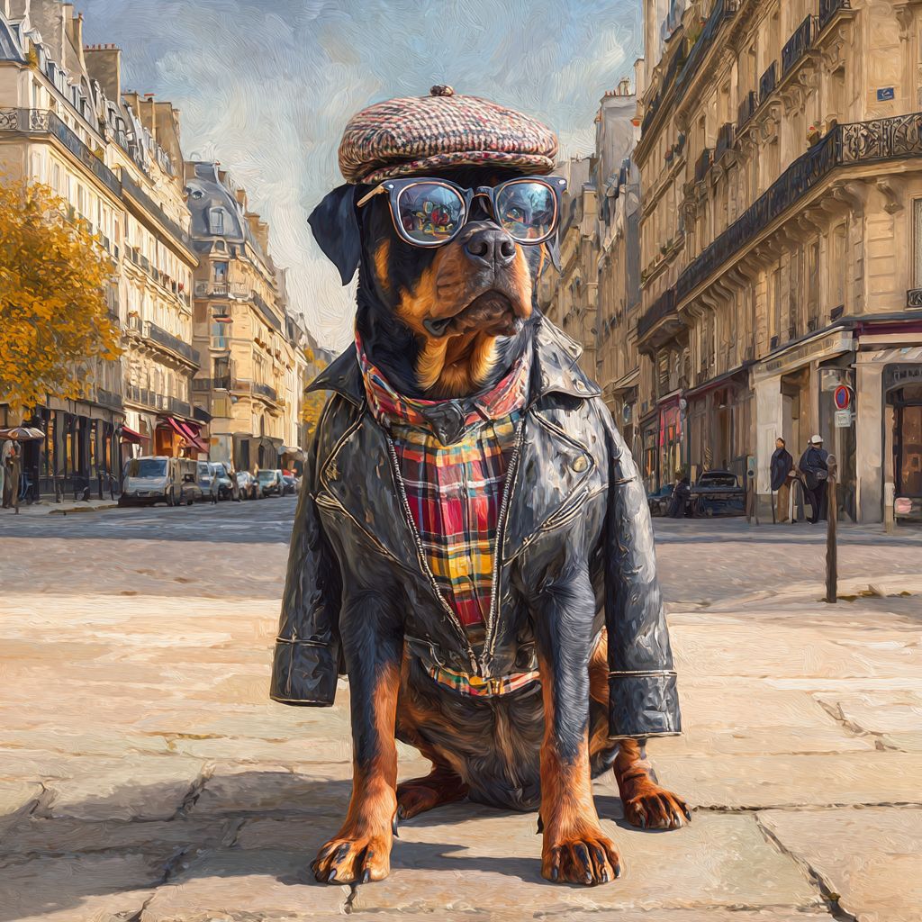 Oil painting; a stylish, fairy-tale Rottweiler in a fashionable leather jacket, plaid jeans, a cap, and glasses stands in the center of Paris; v 5.2 --v 7.0