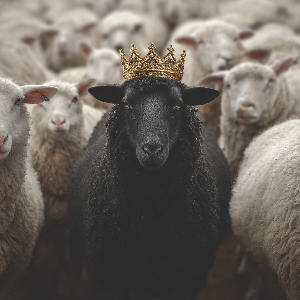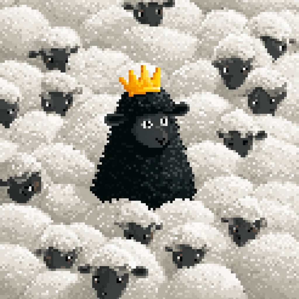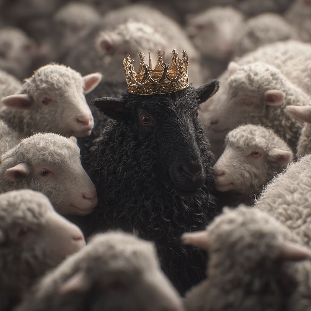 create a picture from a black sheep with a golden crown in a herd of other sheeps where you see in the picture that this sheeps is different or feels different. i need it for a instagram post. the other sheeps were bright white and they are more like npc's and function. the black sheep is in the middle. --v 7.0