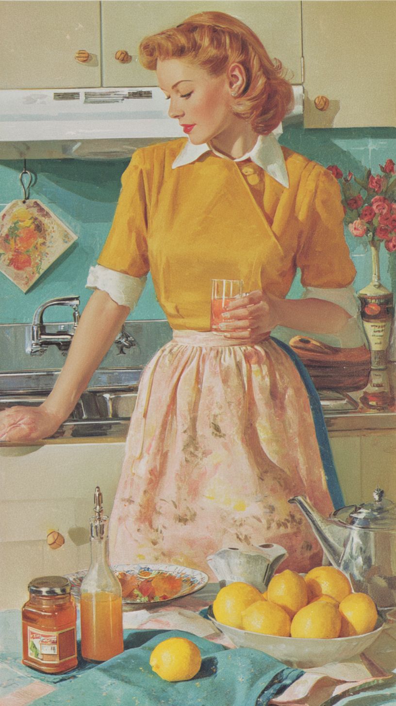 a 1950s housewife ad the housewife is wearing a period specific apron and in the kitchen she is drinking a cocktail book-style cocktail and with the ingredients setting on the kitchen counter the ingredients are fresh ginger, freshly washed lemons, and Manuka honey /steath give room at top --chaos 20 --ar 9:16 --v 7.0