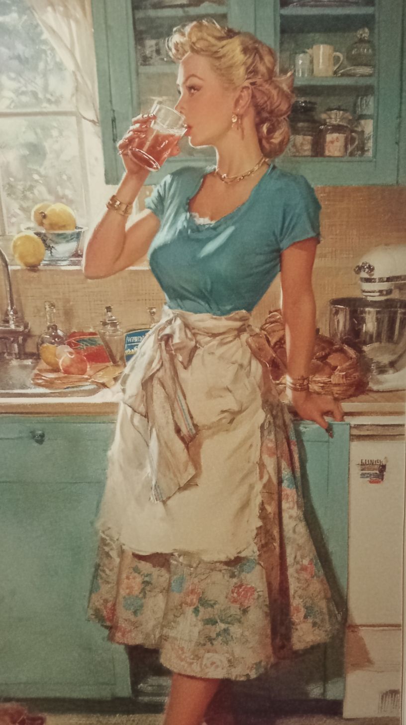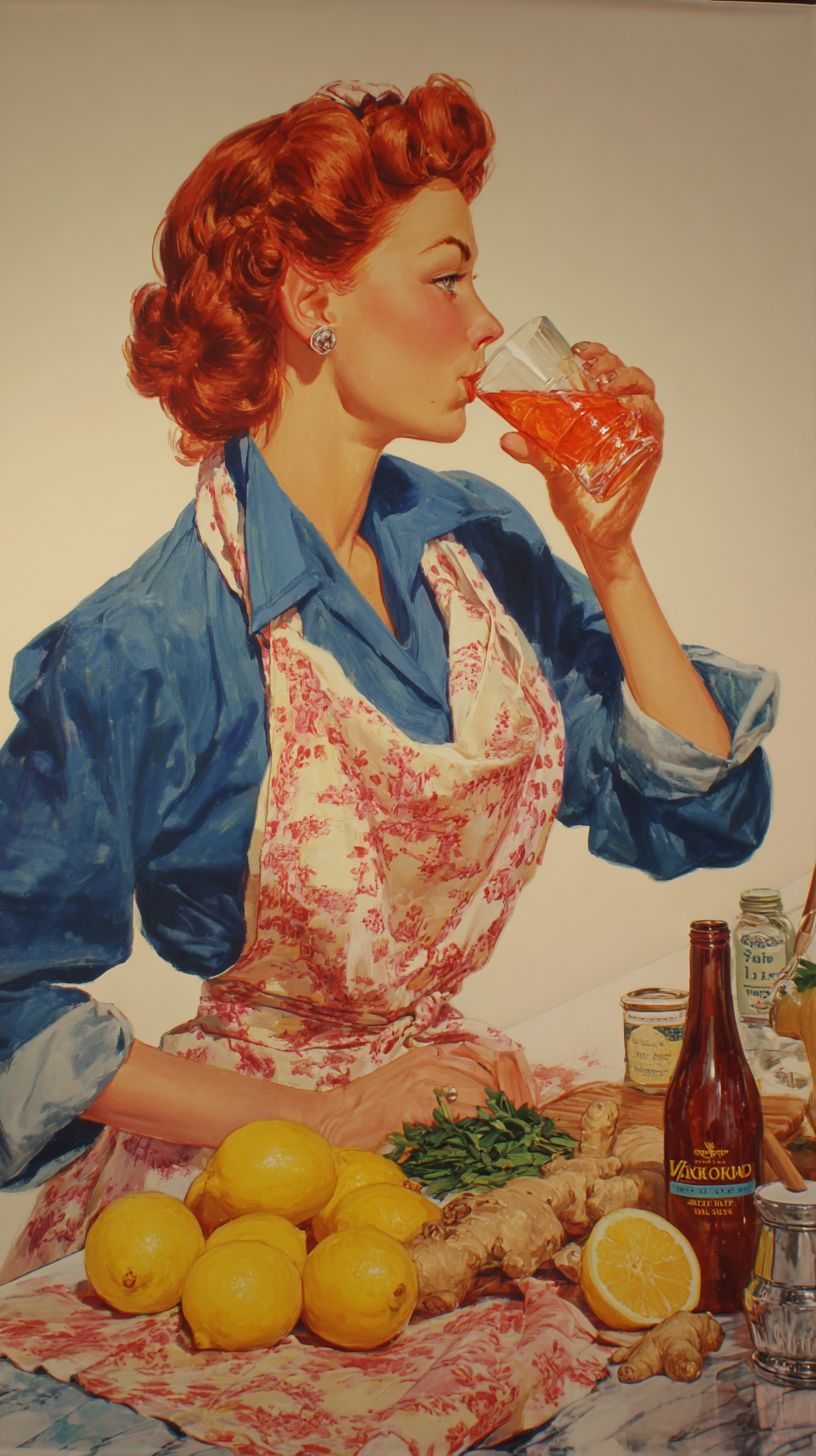 一位1950年代的家庭主婦,穿著具有時期特色的圍裙,在廚房裡喝著一本書風格的雞尾酒,廚房檯面上擺放著新鮮的生薑、剛洗過的檸檬和麥盧卡蜂蜜。