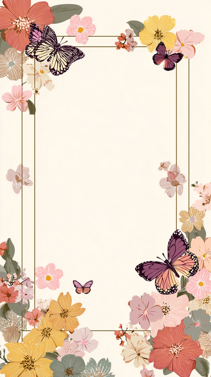 圖像簡約的矢量插圖,內有可愛的蝴蝶和花朵邊框,白色背景,整體構圖對稱平衡,風格為簡單卡通,採用淡色調和極簡設計。