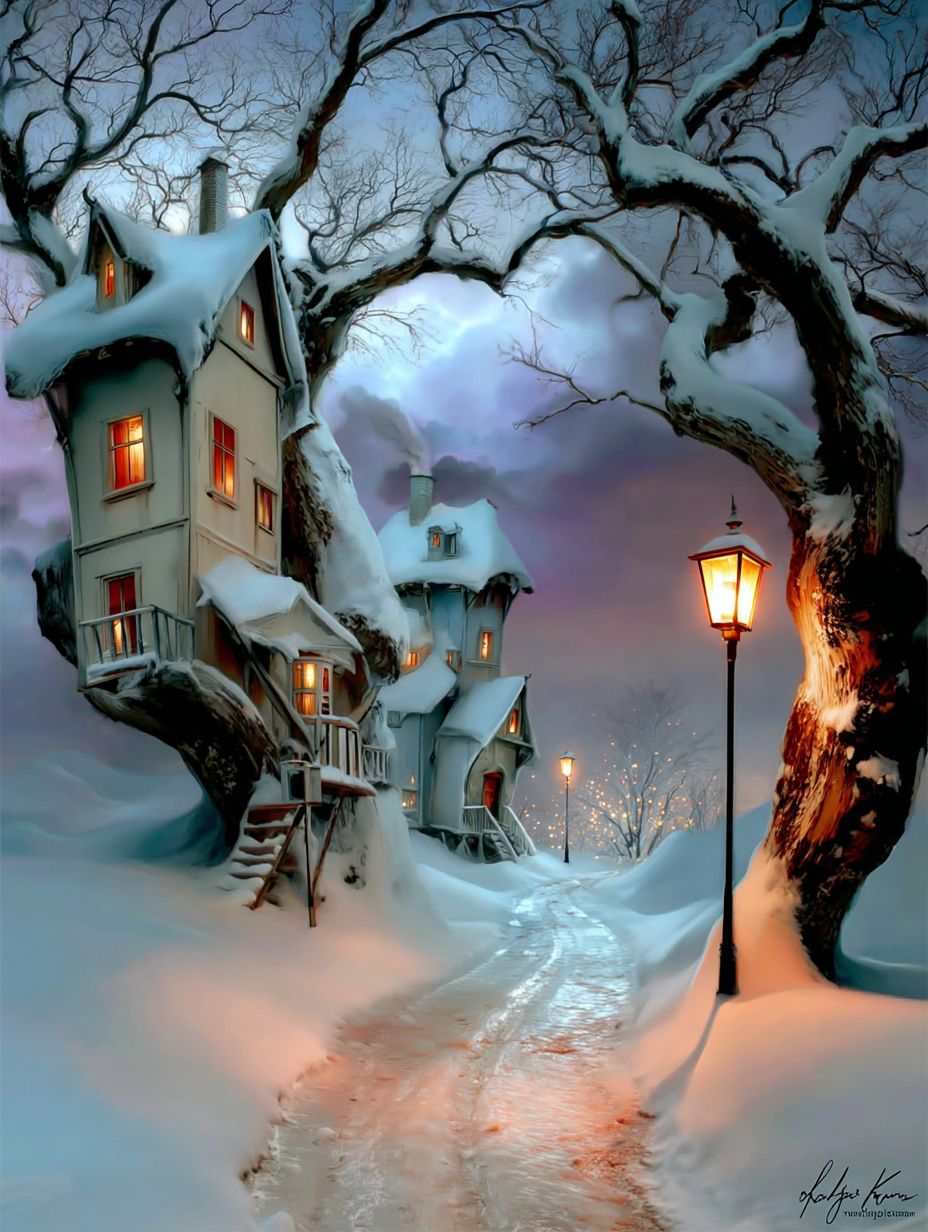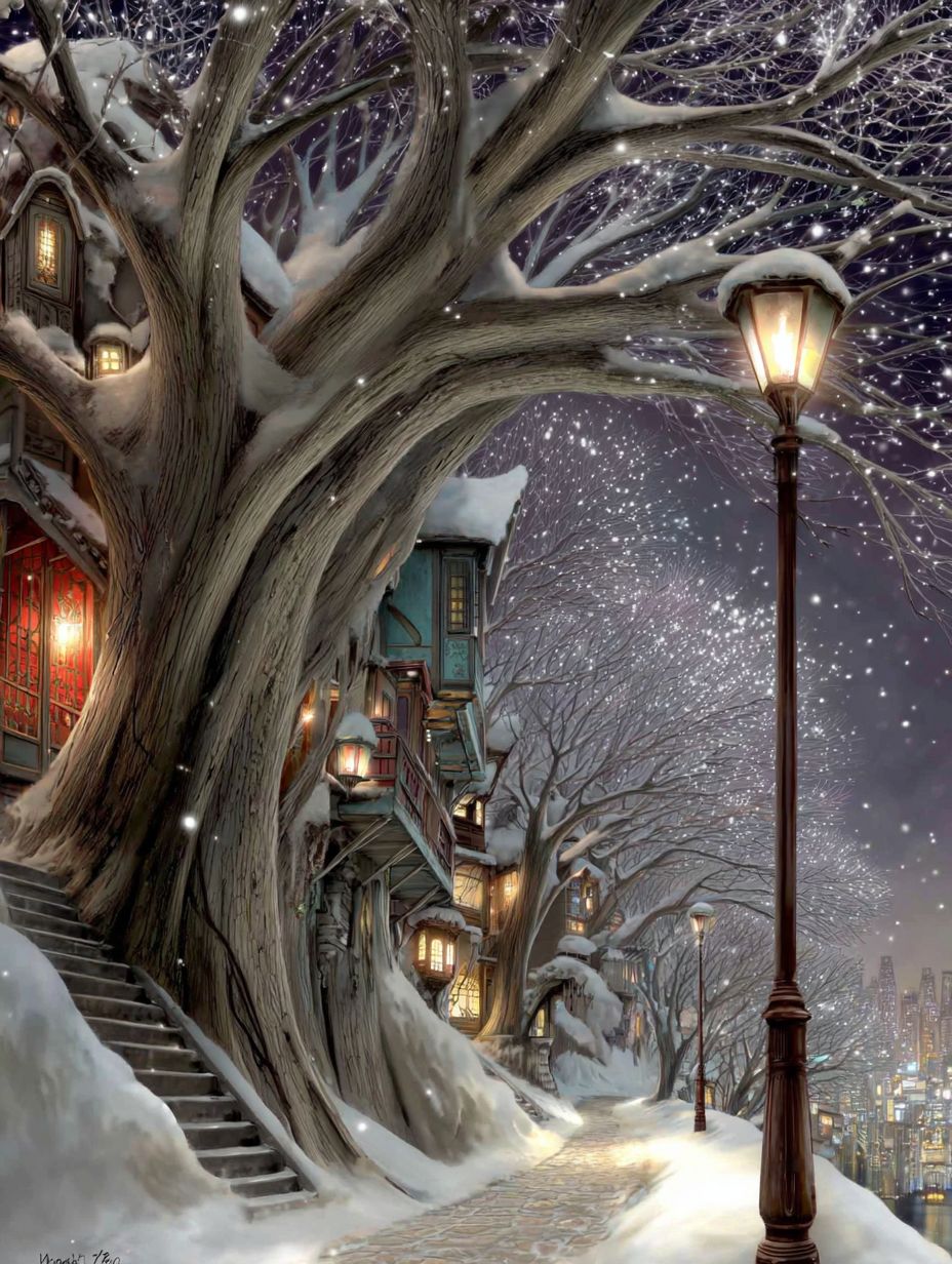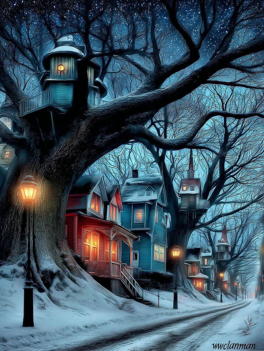 一個寧靜的冬季場景,雪覆蓋的土地,房屋被大樹照亮,星空和溫暖的街燈增添了迷人的氛圍。