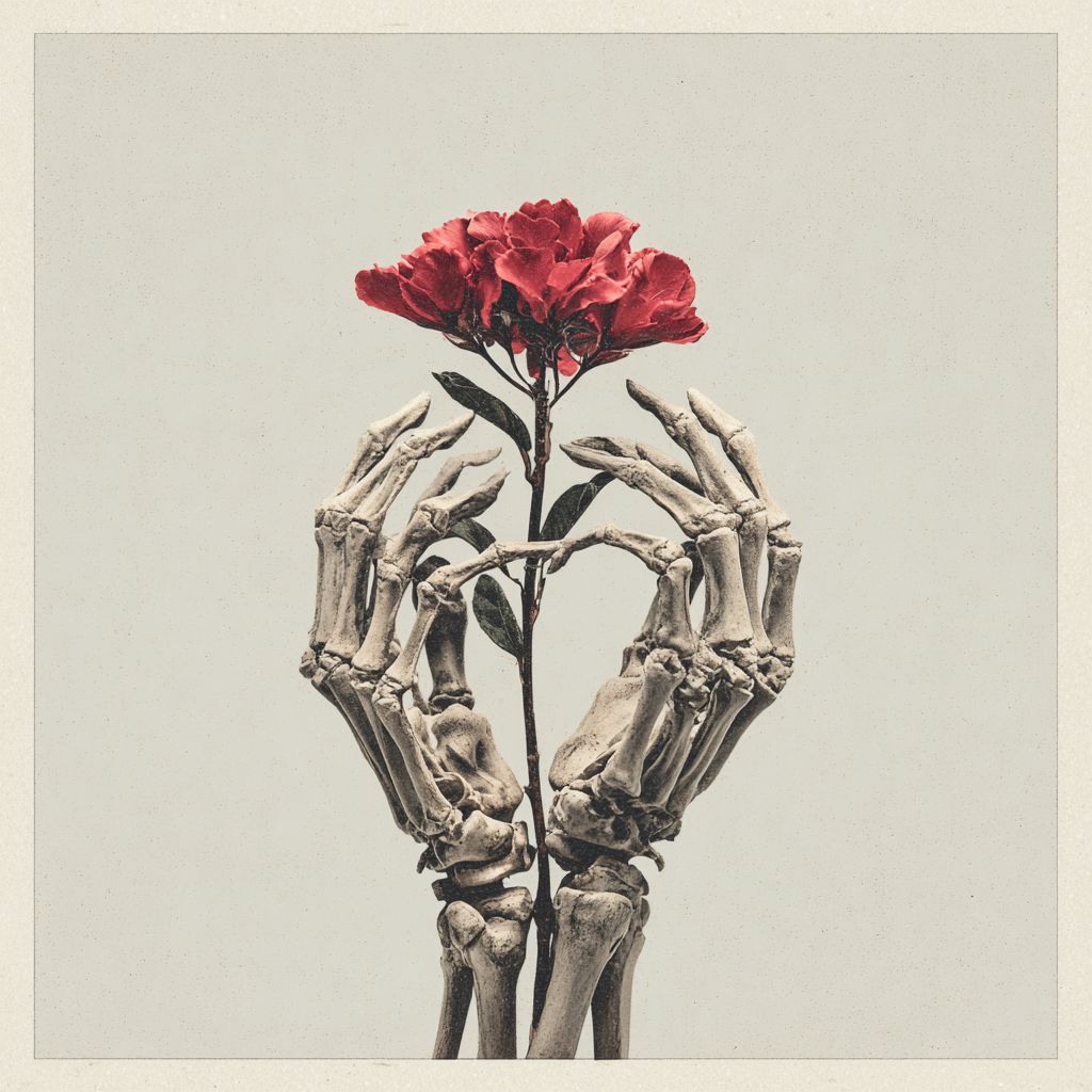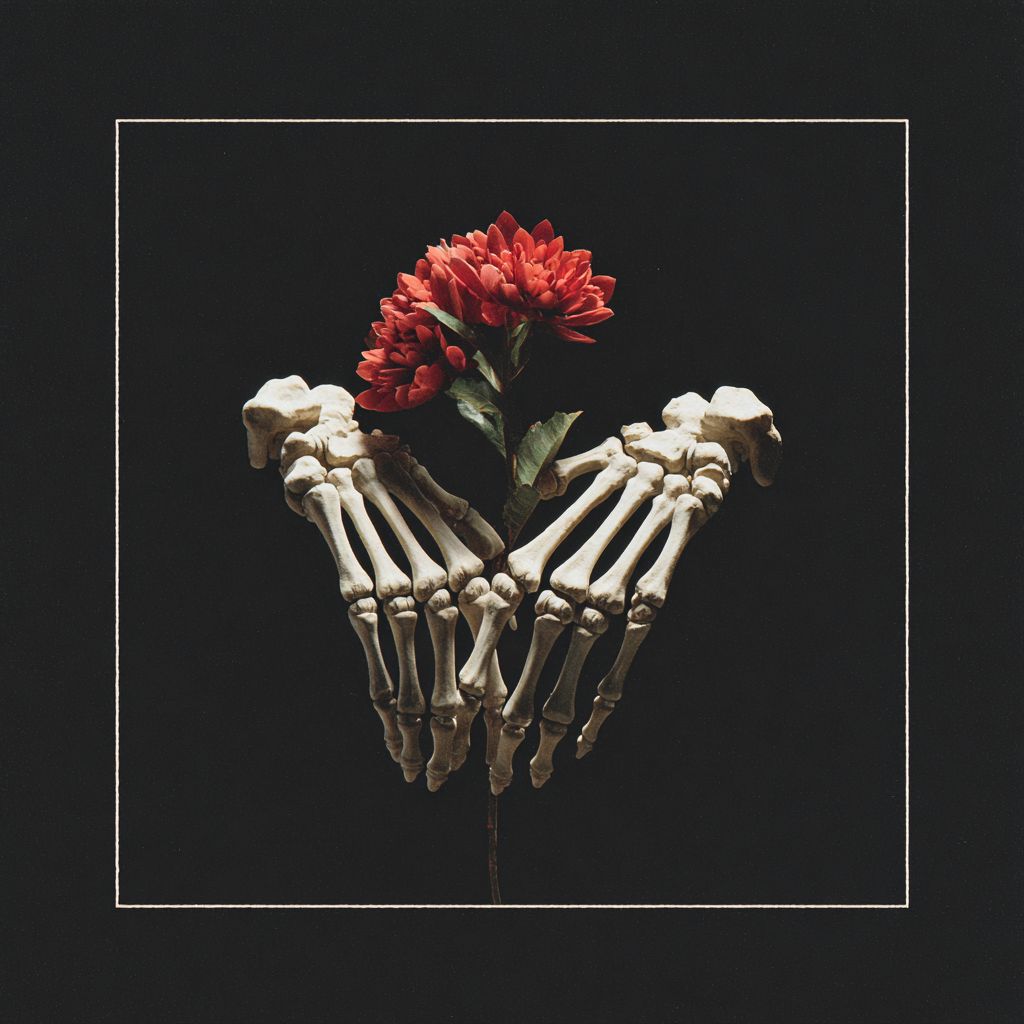 an album single cover: two skeletal hands holding each other and a red blooming flower in between the skeletal palms --v 7.0