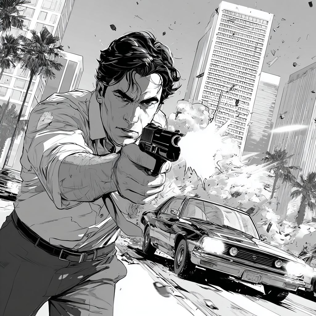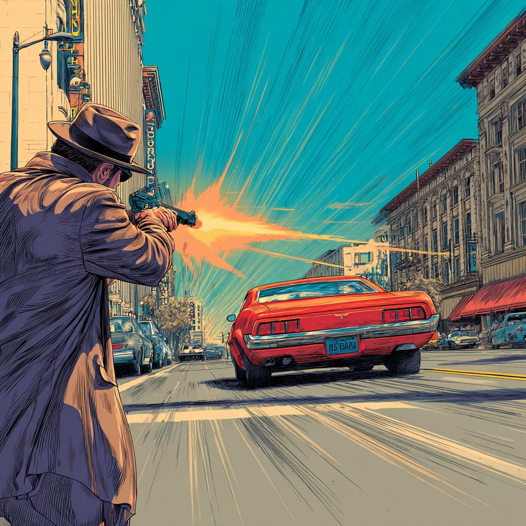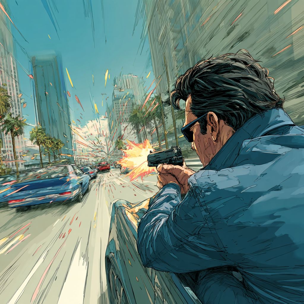 漫畫風格的偵探,似湯姆·克魯斯般在洛杉磯市中心大白天向一輛飛馳而去的汽車開槍。