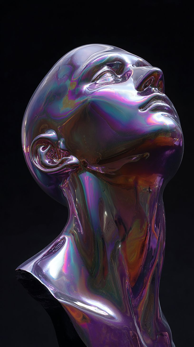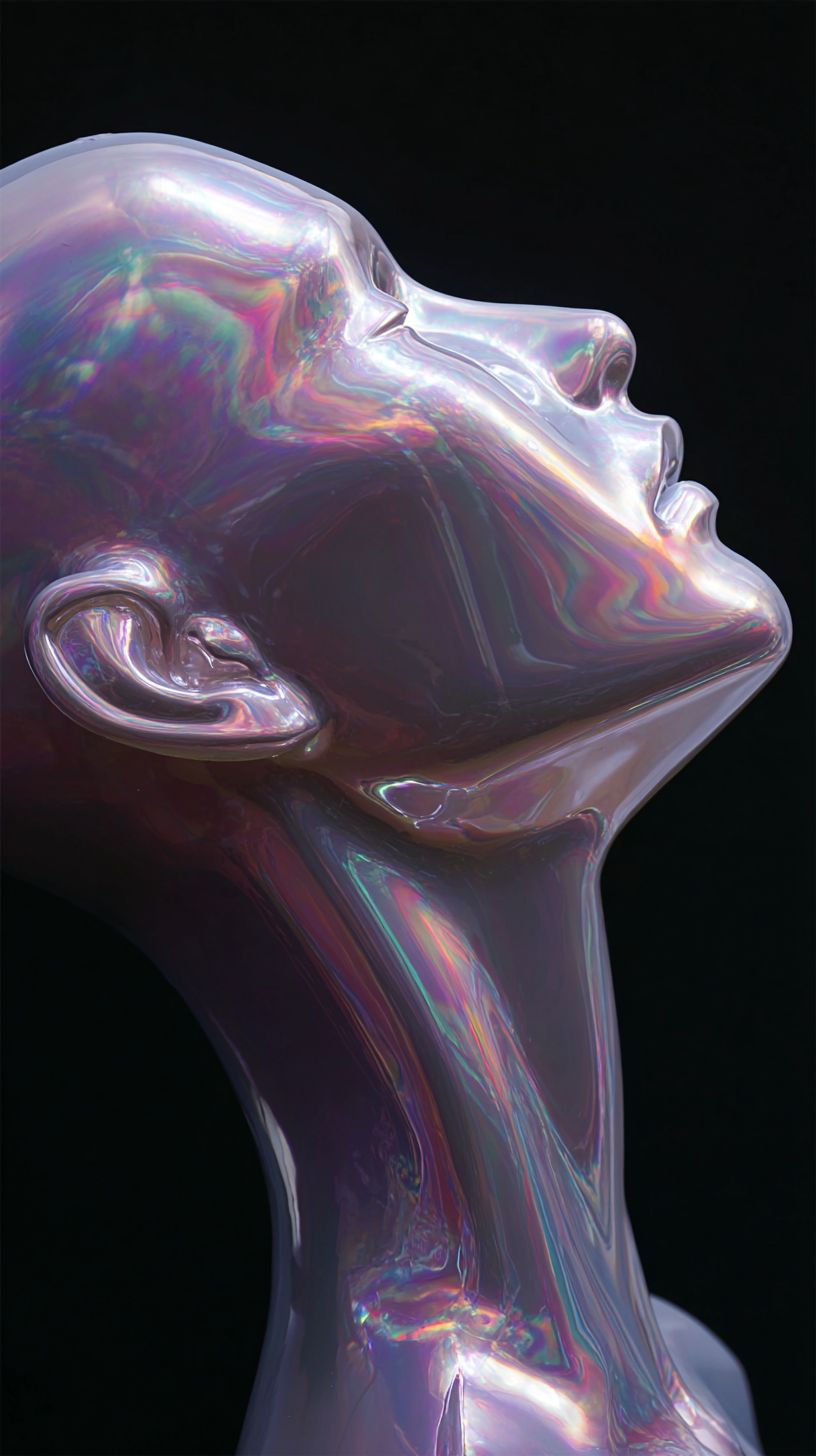 彩虹色全息人類半身像側面,頭部稍微向後仰望,光滑的抽象特徵,液態珍珠光澤表面帶有紫色、青色和粉色的反射,面部細節極少,藝術雕塑形態,純黑背景,垂直構圖