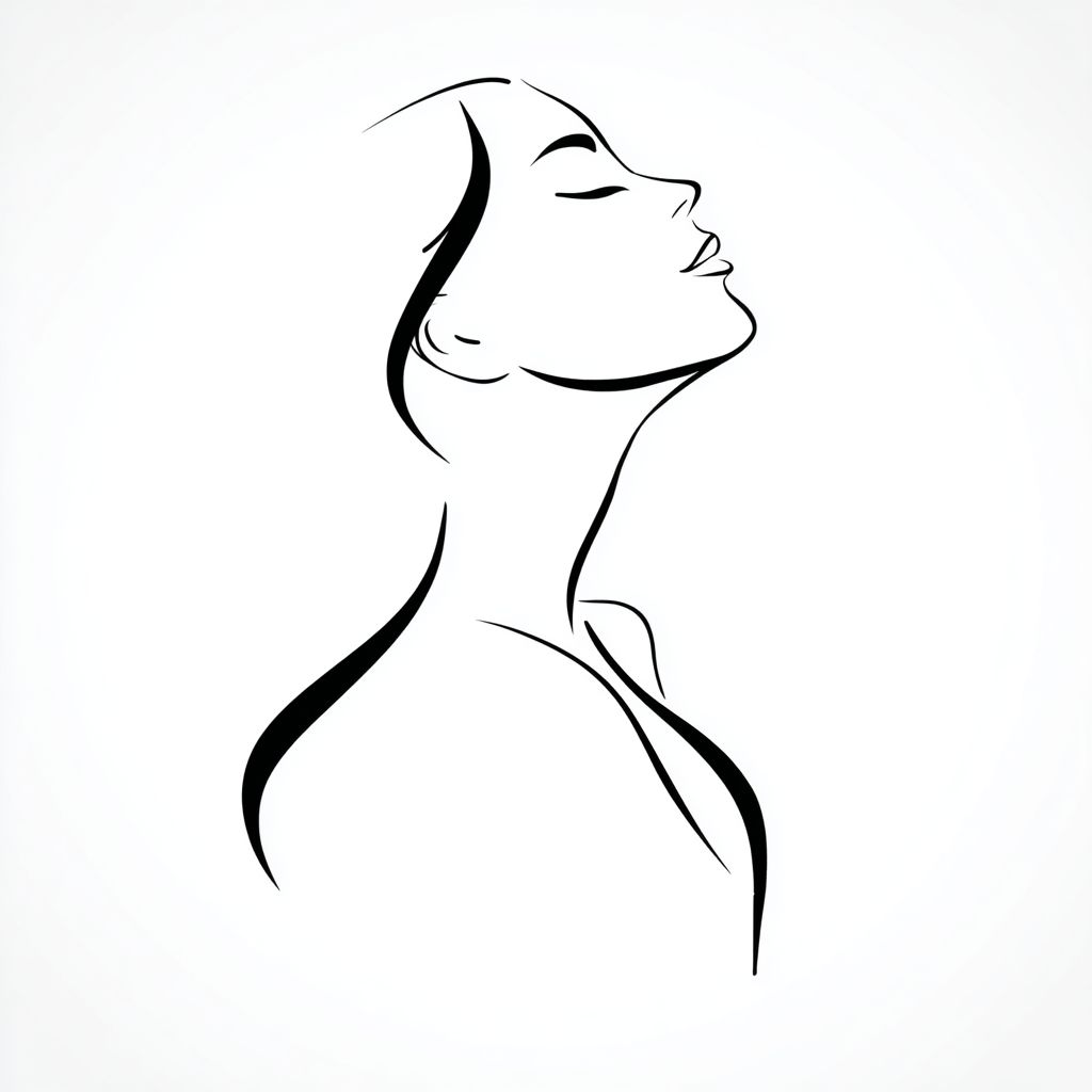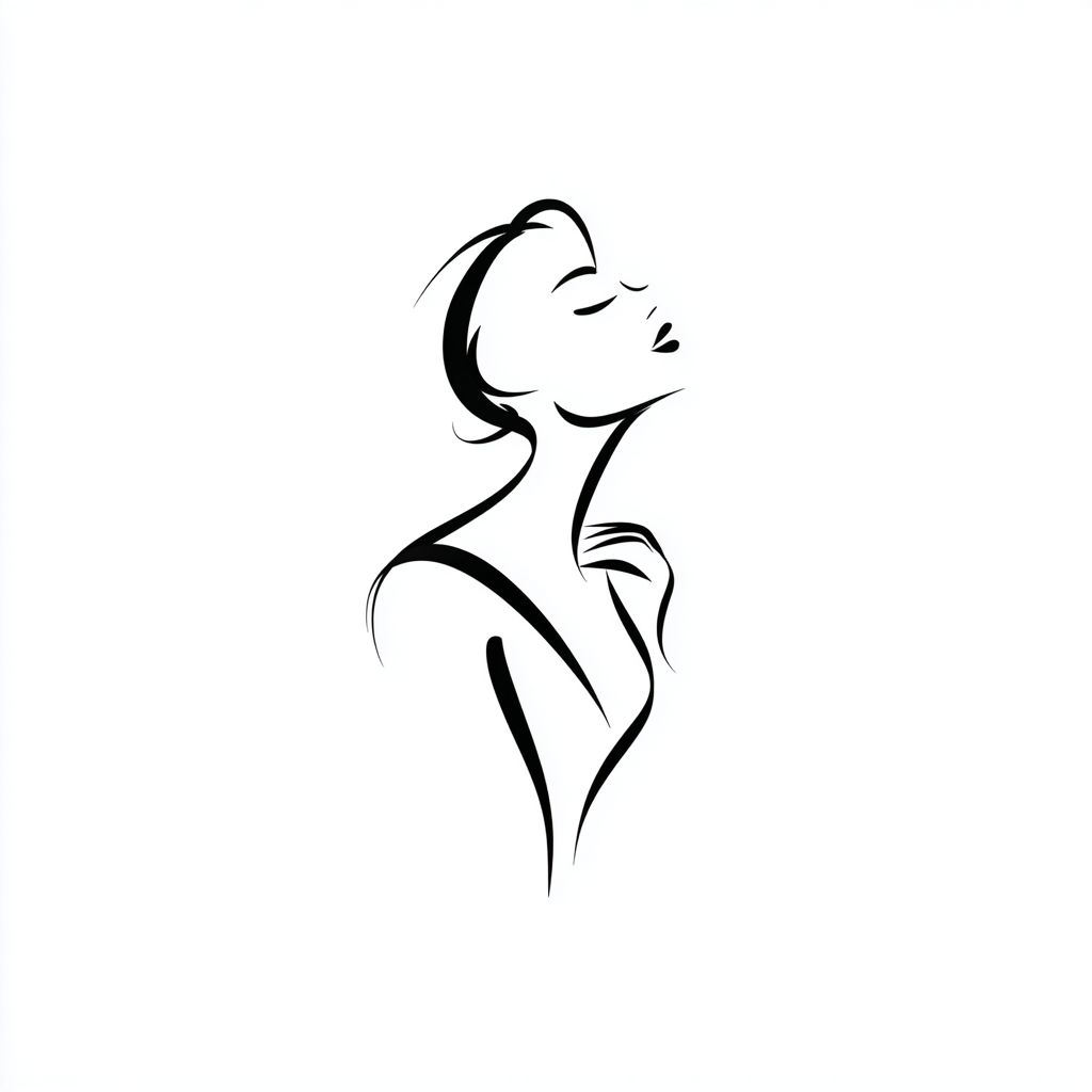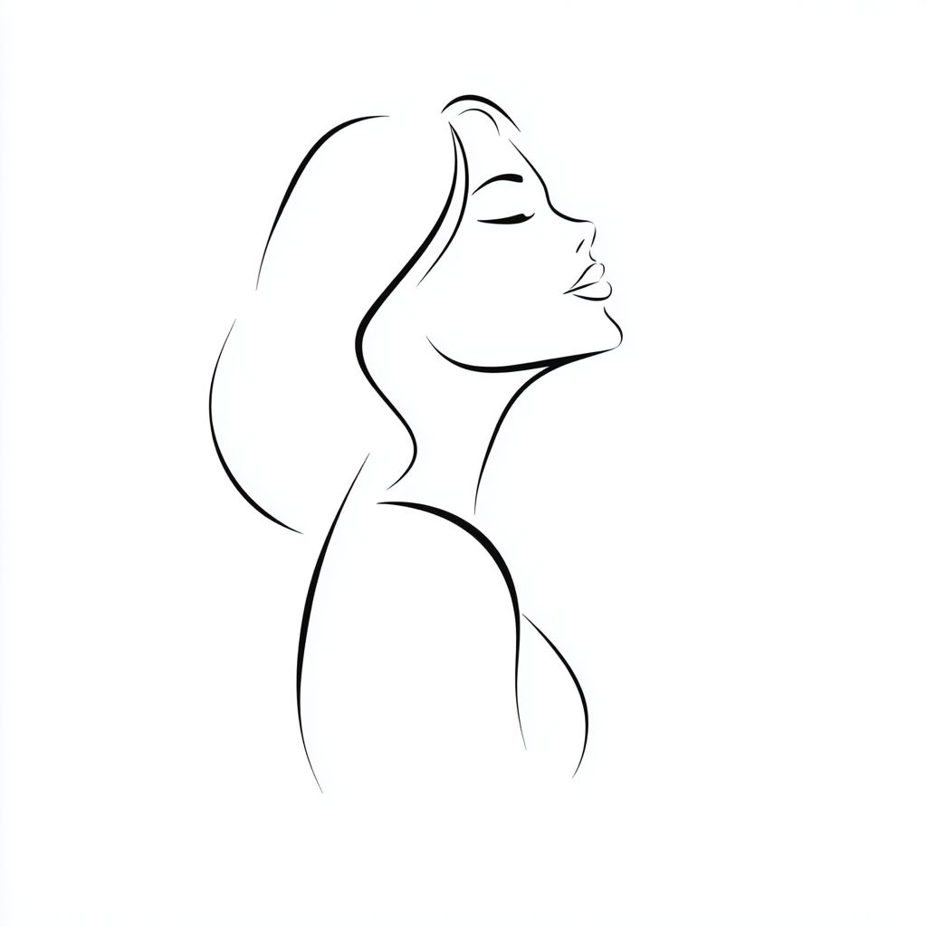 一個極簡主義的線條藝術矢量標誌,側面描繪一位女性,頭部上仰,凝視上方。用中到粗的平滑線條繪製,與參考標誌的筆畫粗細一致,乾淨而自信。線條粗細均勻,沒有變化。沒有實心填充,沒有漸變,沒有陰影。頭髮和身體由簡單流暢的輪廓線構成,簡約而象徵性。手臂用一條單曲線表示,暗示溫柔的自我擁抱。胸部附近整合了一個極簡的意識絲帶,使用相同的線條粗細繪製。平坦、冷靜、適合醫學的美學,適用於乳腺病學/女性健康標誌。在白色背景上的單色線條標誌。清晰的輪廓,可縮放,在小尺寸下可讀。