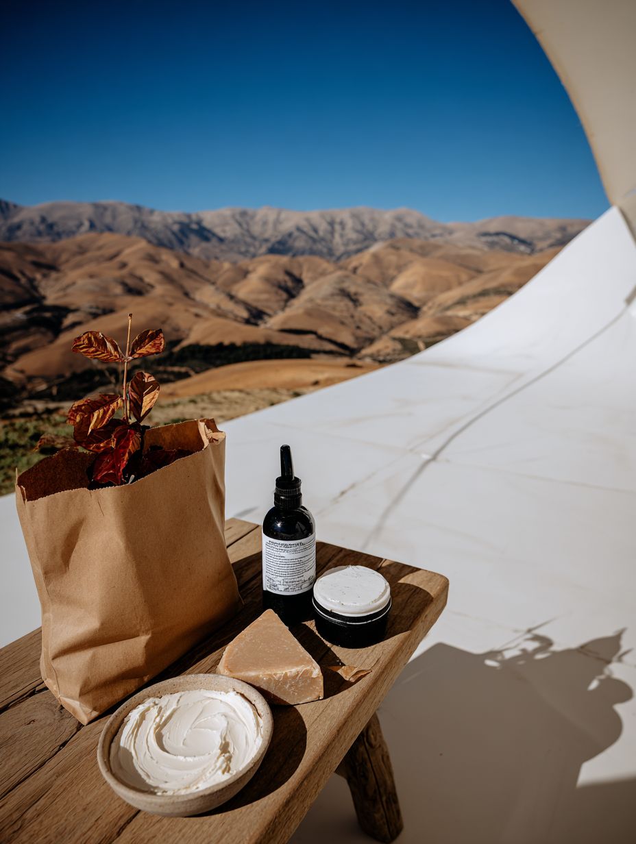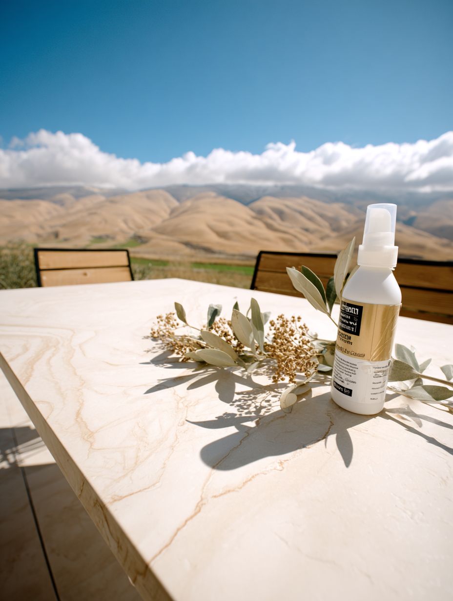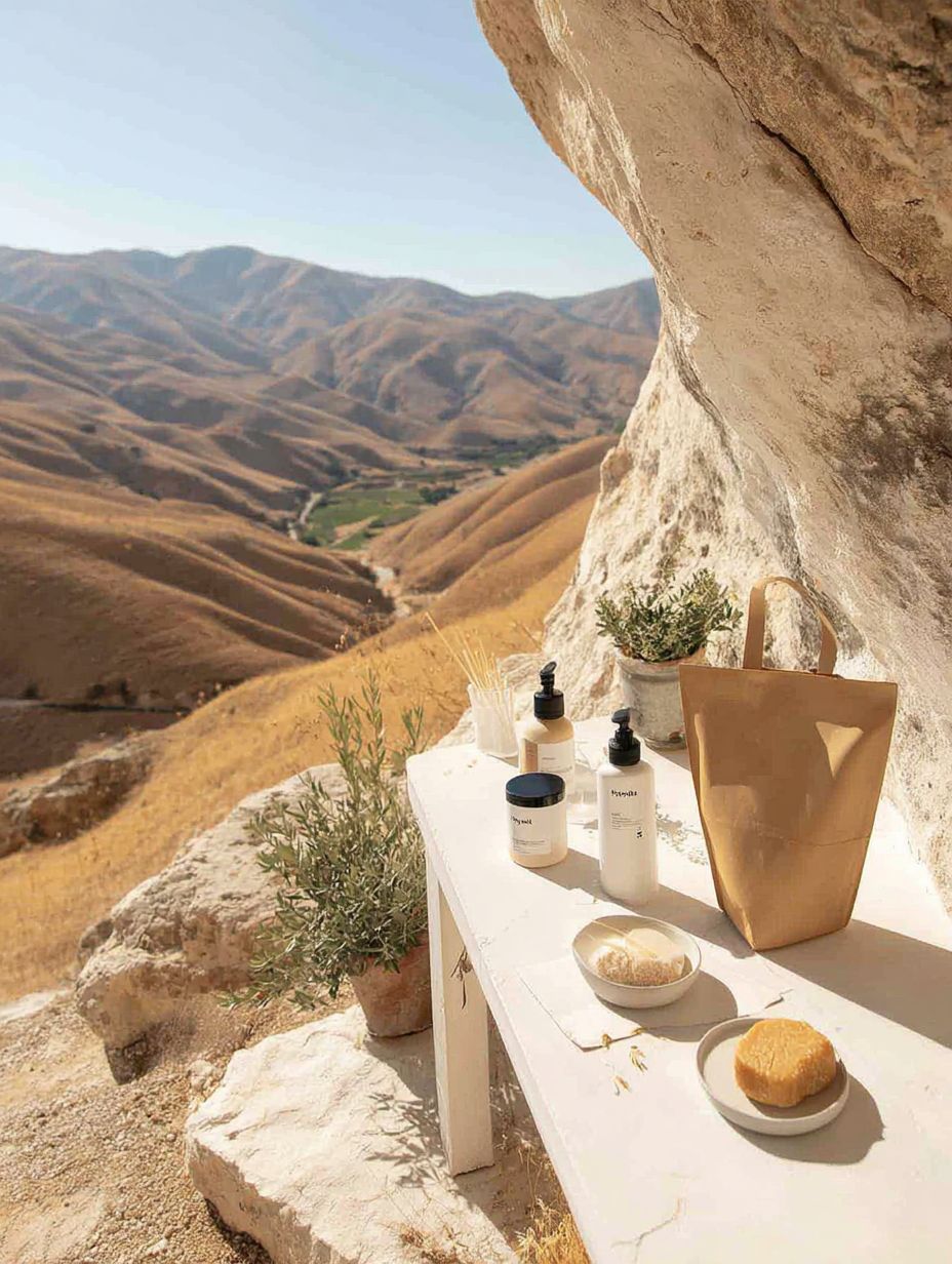 Outdoor artisan workspace in Israeli Jordan Valley, wooden table with natural cosmetics and soaps, dramatic desert mountains and golden hills in background, clear blue sky, warm Mediterranean sunlight, cream stone surface, olive branches and desert botanicals, professional yet natural setup, cream beige mustard gold color palette, trustworthy Israeli brand aesthetic, generous sky space for text --chaos 15 --ar 3:4 --raw --profile 8t3kxmk --weird 3000 --v 7.0