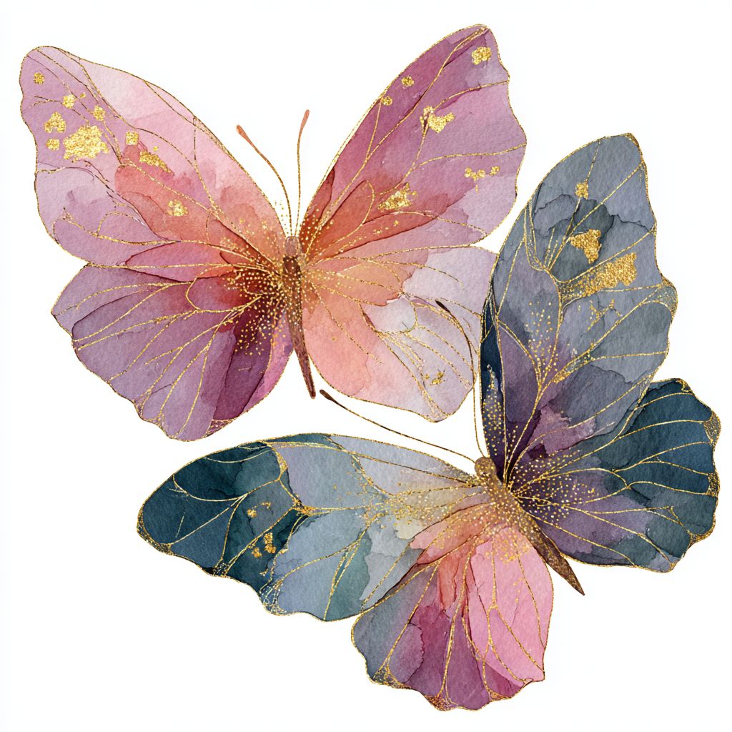 professional watercolour clipart (Two large ethereal butterflies with translucent wings in a gradient of powder pink to muted gray, with veins traced in fine pale gold glitter) white background, minimalistic watercolor, clipart, darker outline. --profile pdld15f --v 7.0