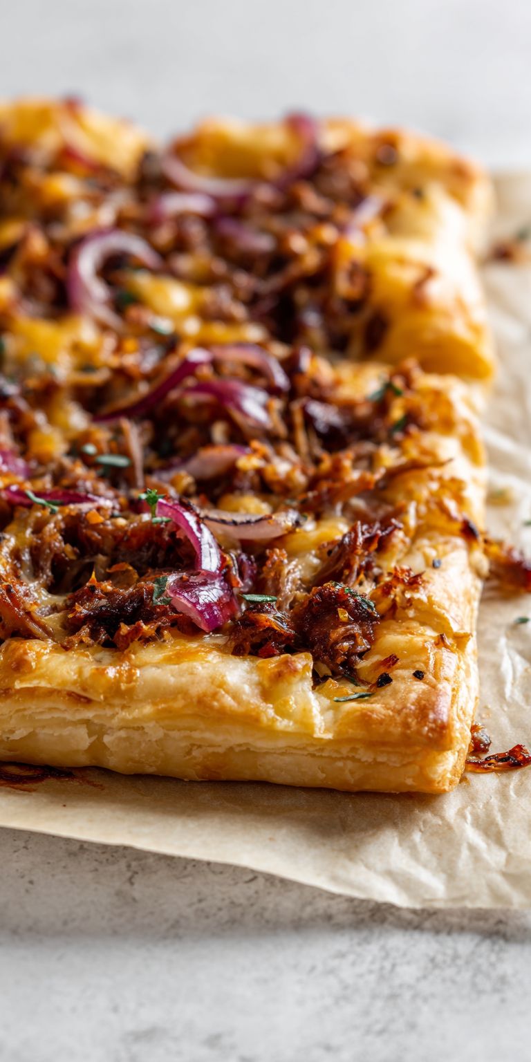 Puff Pastry with pulled pork, pepper jack cheese, finely diced red onion, and melted pepper jack cheese sitting on parchment paper on a clean minimalist plain white countertop, macro shot, professional food photography with studio lighting from a Canon EOS R6 Mark II Mirrorless camera --ar 1:2 --stylize 50 --v 7.0