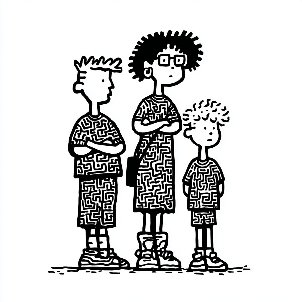 兩個男孩站著,一個媽媽站在旁邊與一個男孩在一起。基思·哈林的圖形風格,簡單的線條,黑白色。