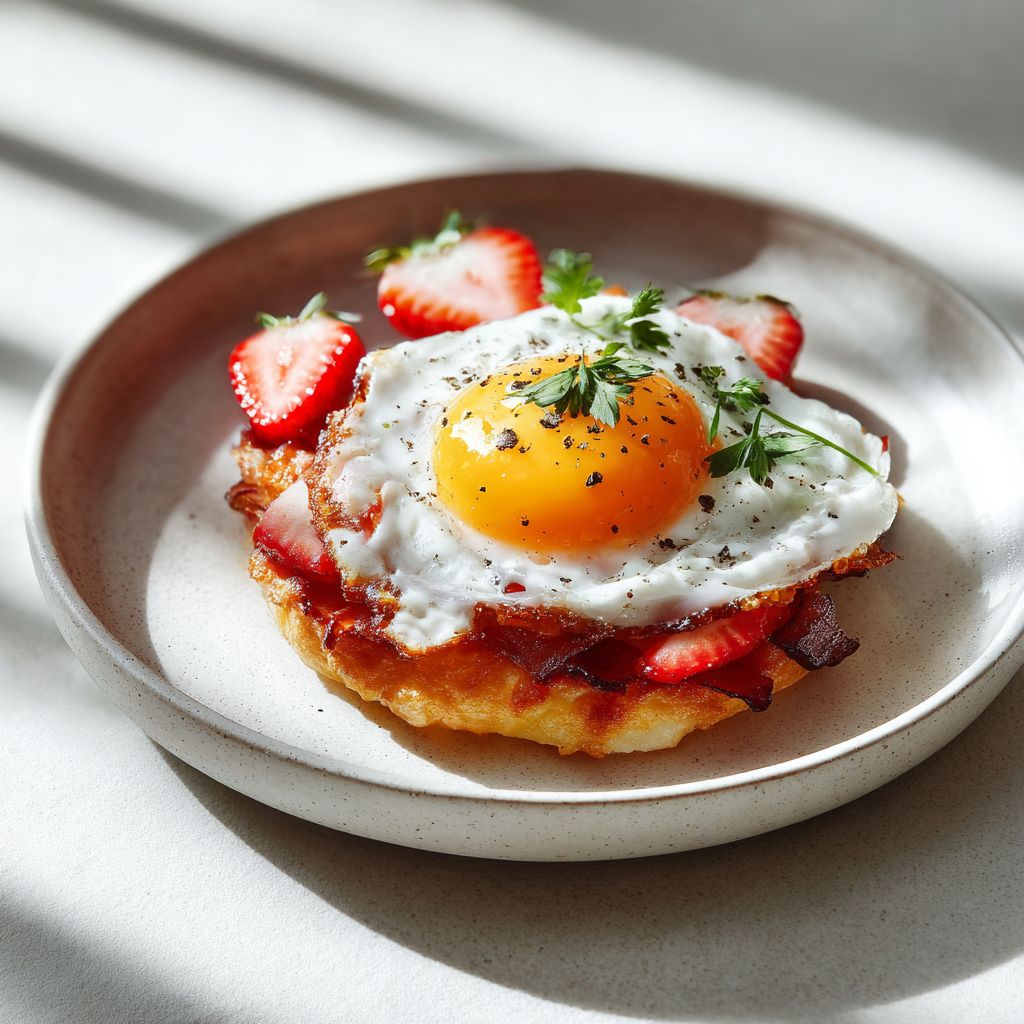 超現實主義的單份蛋類早餐菜肴攝影,乾淨整潔的真實家庭廚房,自然窗光,採用iPhone 15 Pro拍攝,45度角度(不是從上方),近距離誘人的視角,柔和的背景模糊,中心主體有負空間,原始雜誌級真實感,無道具,無文字,無手。