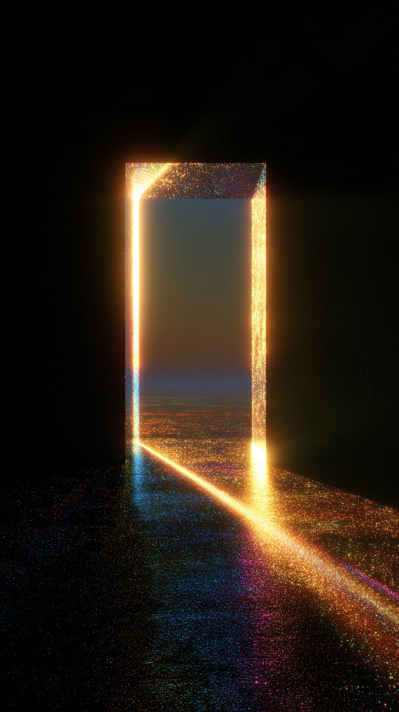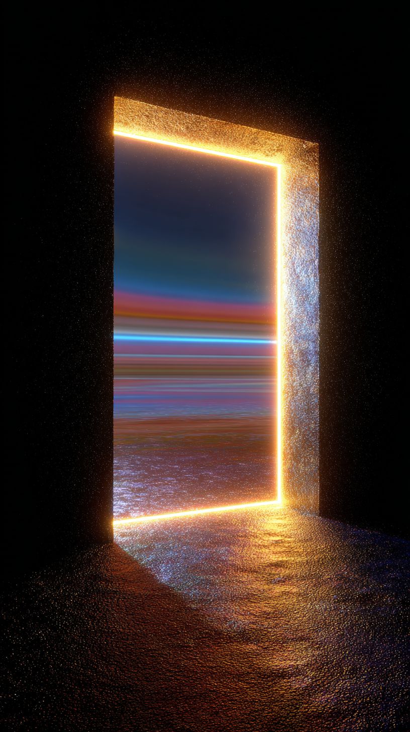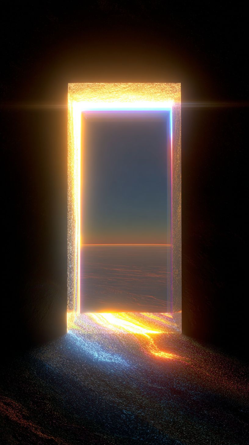 在深邃而天鵝絨般的黑暗中漂浮著一個柔和發光的矩形門戶窗口,溫暖的光芒向外發散,內部充滿了層次分明的珍珠色漸變和微妙的氛圍深度,暗示著廣闊的空間,但並未揭示具體的世界,既迷人又神秘,光與影之間的微妙對比,細膩的CRT光溢出和精細的模擬膠卷顆粒,夢幻波復古未來主義的美學,柔和的青色和溫暖的象牙色散發著微弱的柔和品紅色光芒,控制的黑暗包圍著門戶,完全對稱的構圖,超越時間的邊緣氣氛,歡迎、好奇和通往其他世界的視覺符號,方形格式,Instagram 個人資料圖片,簡約、標誌性,像徽標一樣。