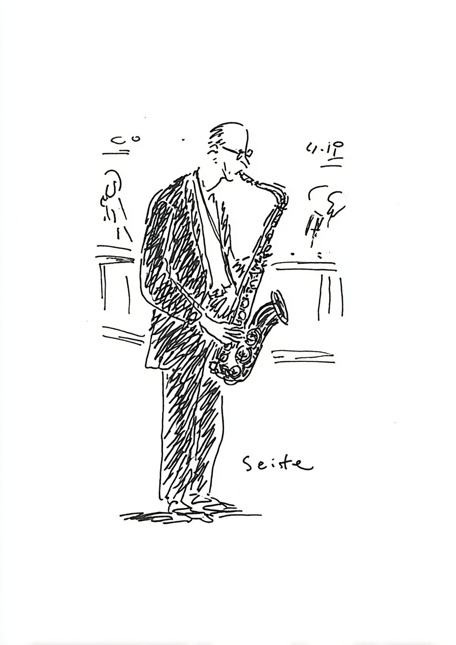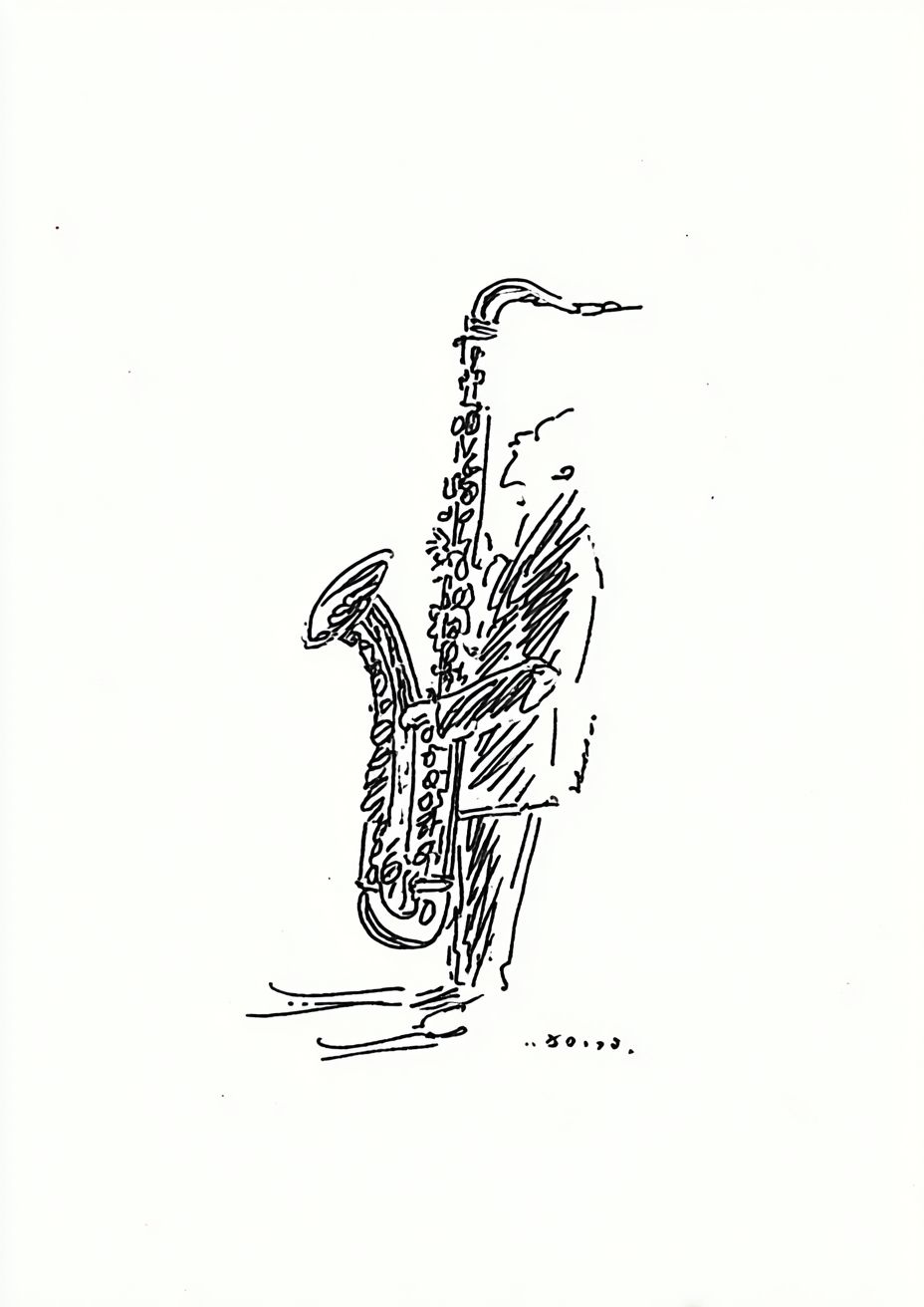 Dieter Rams style design, white, minimal, retro, Jazz bar saxophonist Kenny G, type Kenny G --ar 100:141 --raw --sref 1592324284 --stylize 50 --v 7.0