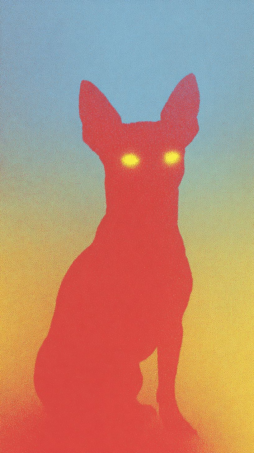 a red silhouette of the shape and outline of a chihuahua dog with glowing yellow eyes, against a gradient background from light yellow to red-blue. The image has a grainy, minimalist, low-saturation, blue to red color scheme, in the style of james turrell and hiroshi nagai. The style is minimalist and surreal, with a risograph or riso print texture, grain, and halftone effects. the design features simple, stylized shapes and shadows. --ar 9:16 --s 50 --raw