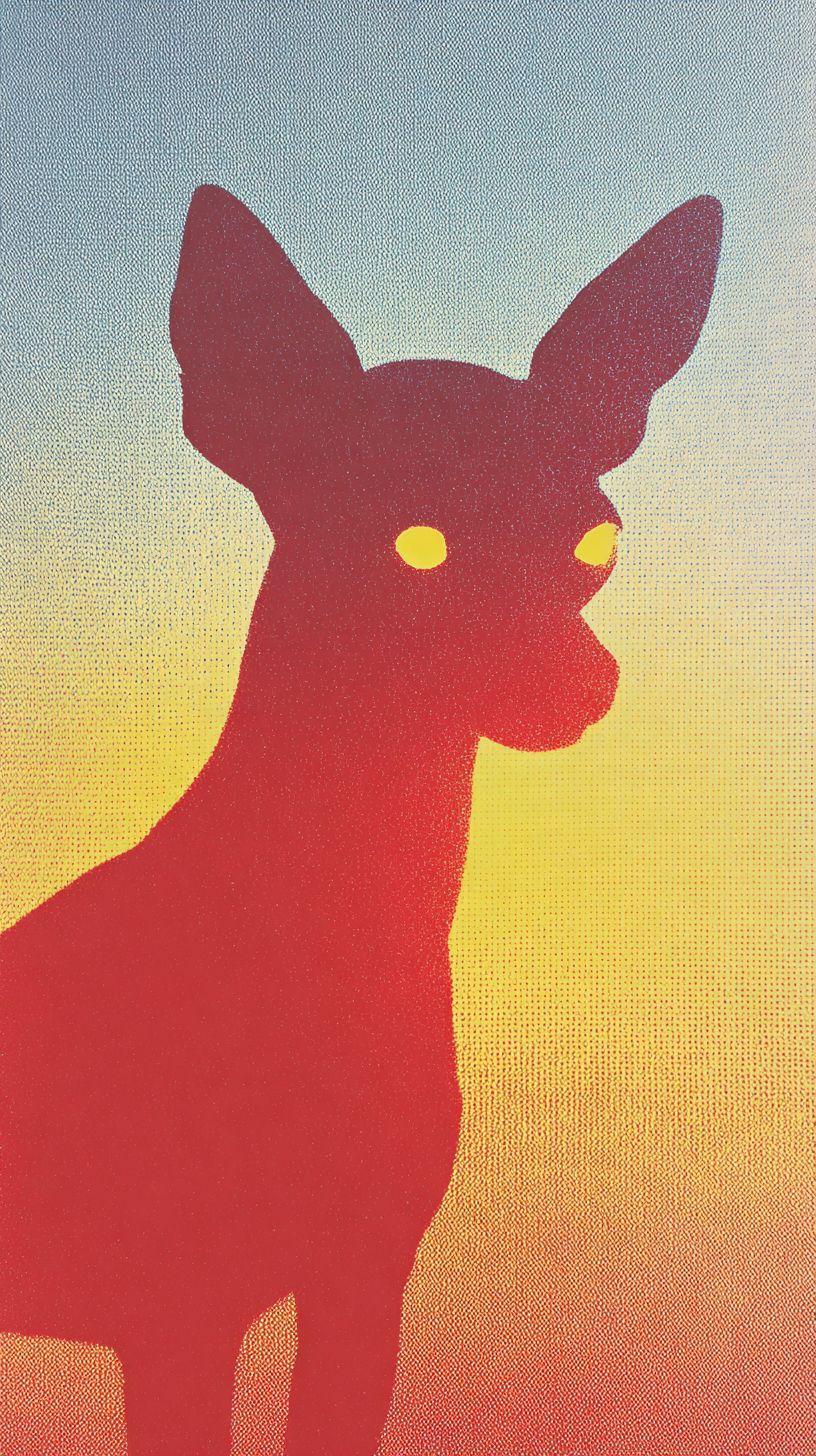 一隻紅色輪廓的吉娃娃狗的形狀和輪廓,發出耀眼的黃色眼睛,背景是從淺黃色到紅藍色的漸變。圖像呈現出顆粒感、極簡、低饱和度的藍色到紅色配色方案,風格受到詹姆斯·特瑞爾和永井博的啟發。風格極簡而超現實,具有絲印或Riso印刷紋理、顆粒感和半色調效果。設計特色是簡單、風格化的形狀和陰影。