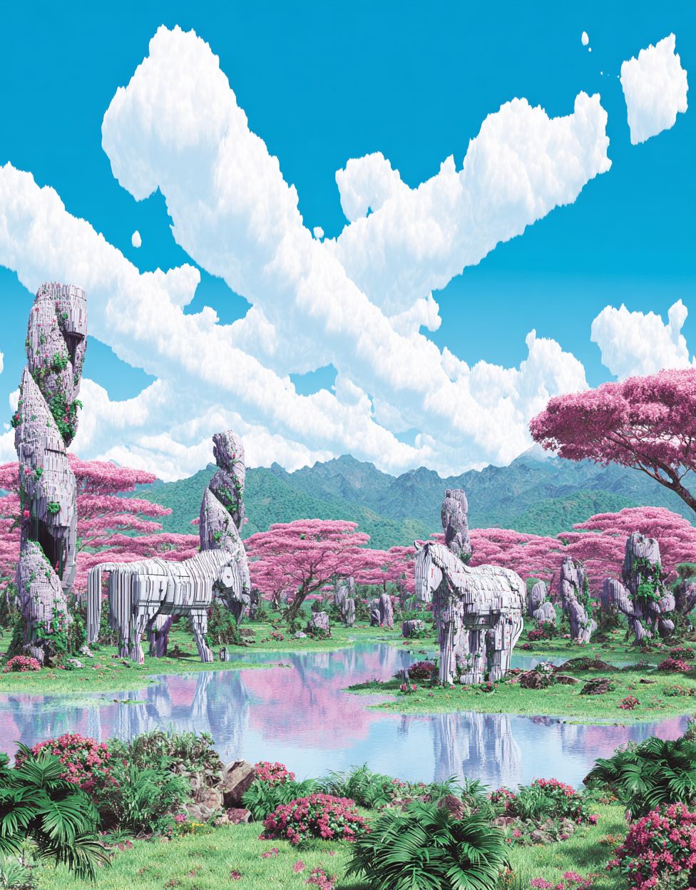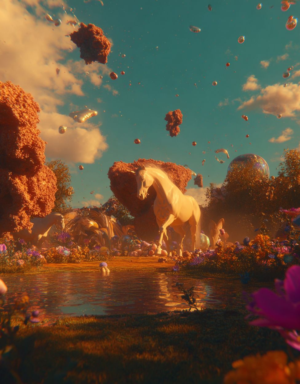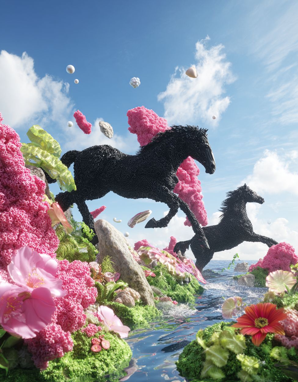 一幅外星花園的照片,裡面有用珊瑚製成的馬和樹,空氣中漂浮著鉻、苔蘚和珍珠。地面覆蓋著茂盛的綠色植物和五彩繽紛的花朵。背景是一片藍天和白雲。水在一切之下。感覺夢幻而超凡,靈感來自日本動漫風格的插圖和超現實主義繪畫。