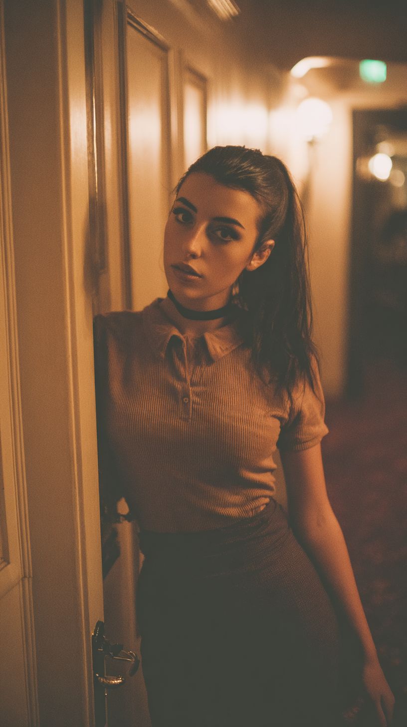 電影般的靜態畫面,85mm鏡頭,酒店走廊。一位二十出頭的西班牙美女站在一扇門外,一隻手靠在門把手上。長長的棕色馬尾,橄欖色的皮膚被牆上的壁燈柔和地照亮。大大的棕色眼睛看向鏡頭,濃密的睫毛,非常豐滿的嘴唇微微張開,穩穩地呼吸著。一件合身的襯衫扎進短裙裡,纖細的腰身襯托出強健的下半身輪廓,塑造出獨特的服裝和陰影效果。皮革項圈和淡淡的妝容。走廊鋪有地毯,窗外傳來模糊的城市噪音,猶豫不決的姿態,影片顆粒感。